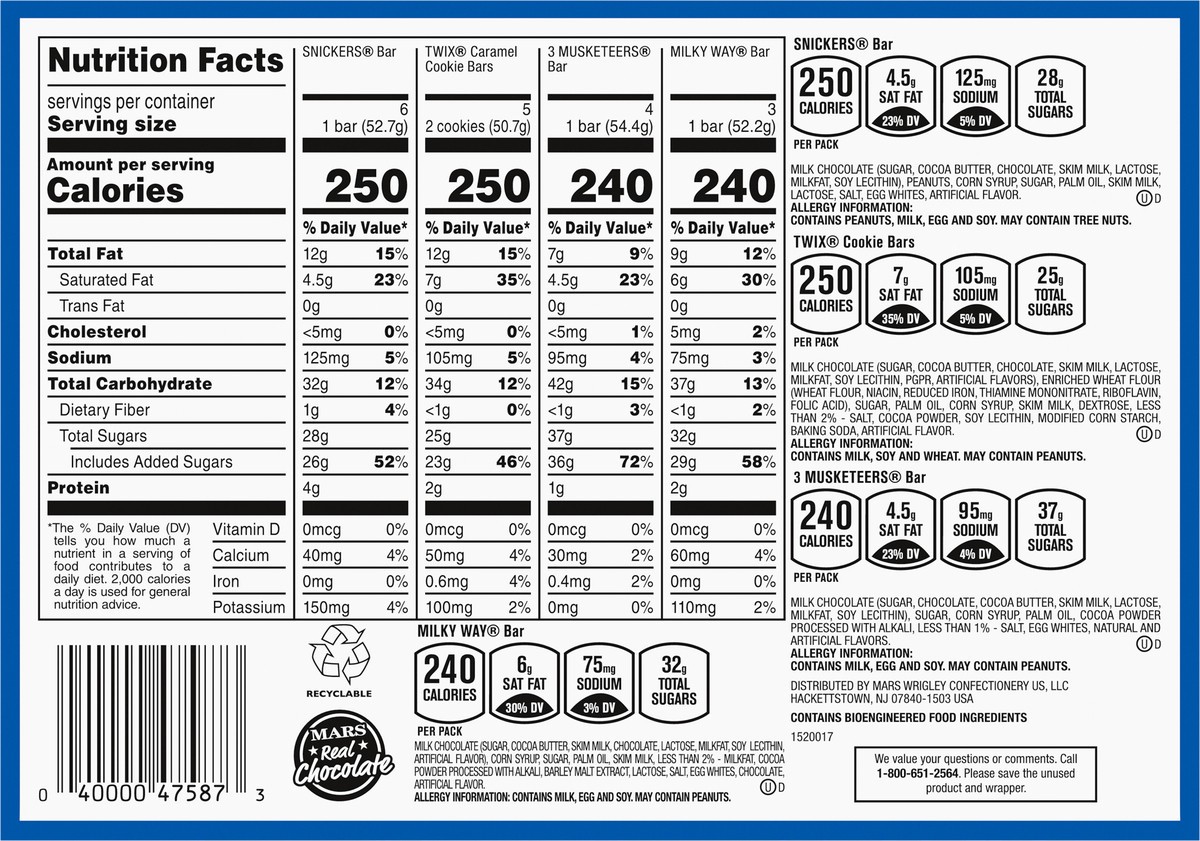 Snickers Bar: Milk Chocolate (Sugar, Cocoa Butter, Chocolate, Skim Milk, Lactose, Milkfat, Soy Lecithin), Peanuts, Corn Syrup, Sugar, Palm Oil, Skim Milk, Lactose, Salt, Egg Whites, Artificial Flavor.…