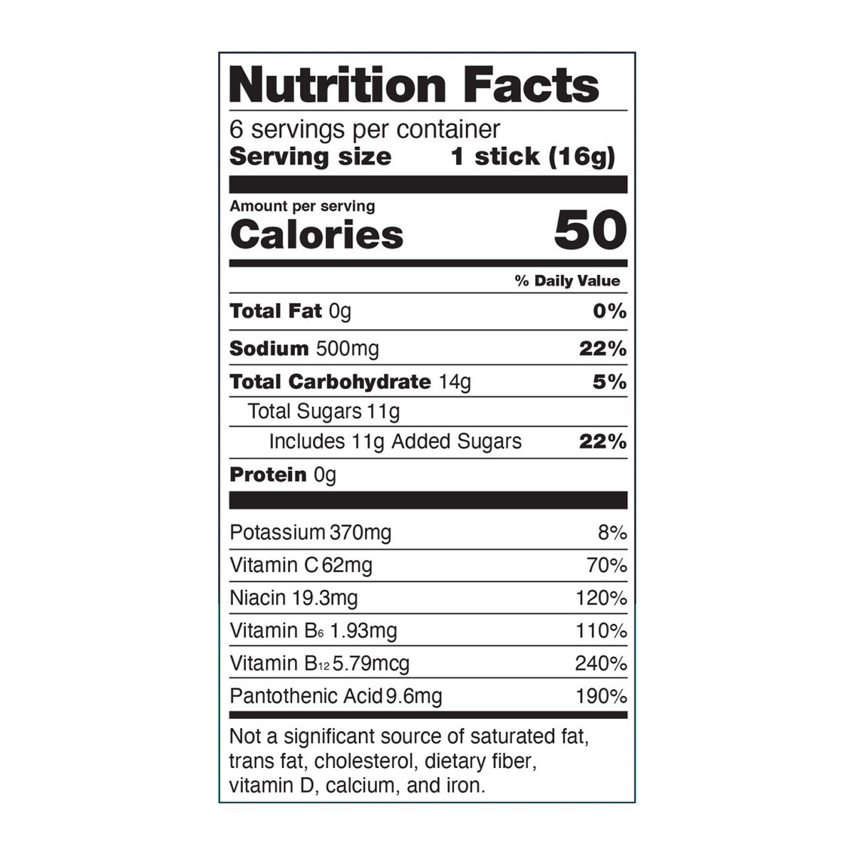 Cane Sugar, Dextrose, Citric Acid, Salt, Potassium Citrate, Sodium Citrate, Dipotassium Phosphate, Silicon Dioxide, Vitamin C (Ascorbic Acid), Natural Flavors, Stevia Leaf Extract (Rebaudioside A), Vi…
