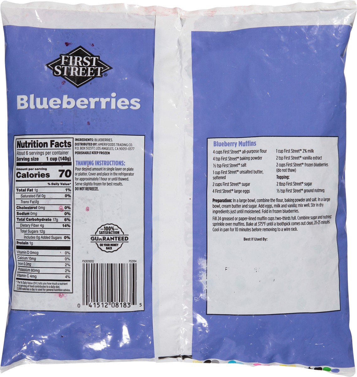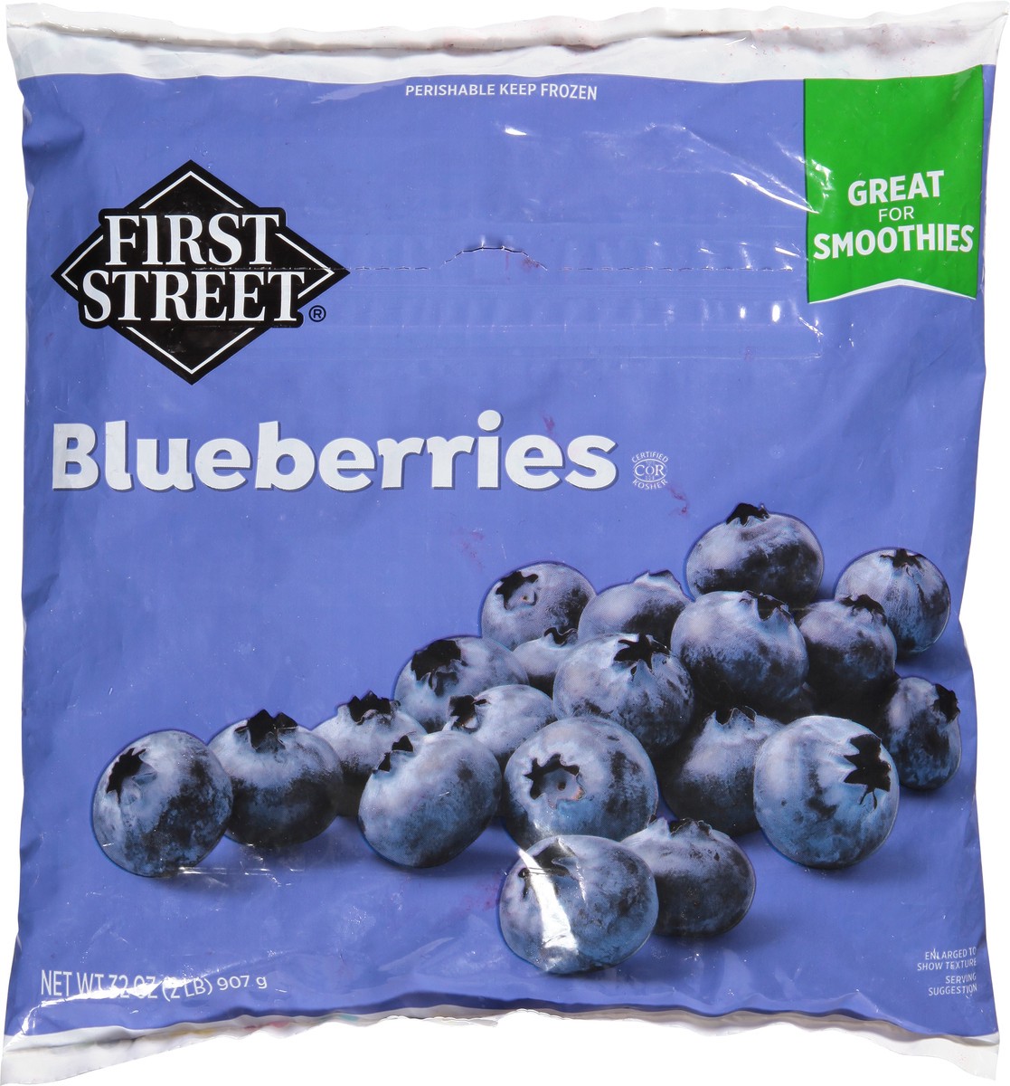 First Street Blueberries, Frozen freshness. First Street Blueberries are picked at peak ripeness and flash-frozen. Perfect for baking muffins, topping oatmeal, or blending into smoothies.