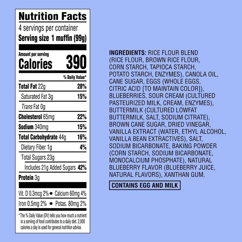RICE FLOUR BLEND (RICE FLOUR, BROWN RICE FLOUR, CORN STARCH, TAPIOCA STARCH, POTATO STARCH, ENZYMES), CANOLA OIL, CANE SUGAR, EGGS (WHOLE EGGS, CITRIC ACID [TO MAINTAIN COLOR]), BLUEBERRIES, SOUR CREA…
