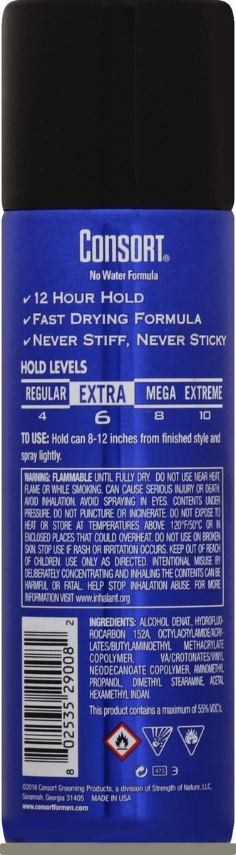 Great hold. Never stiff. Never sticky. Contains no water. 12 hour hold. Fast drying formula. Never stiff, never sticky. Hold Lever: extra 6. This product contains a maximum of 55% VOC's. www.consortfo…