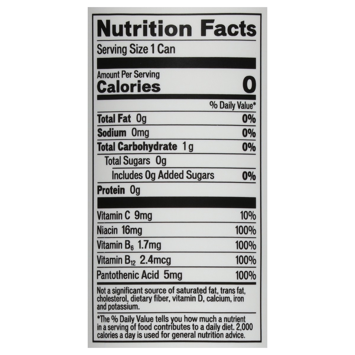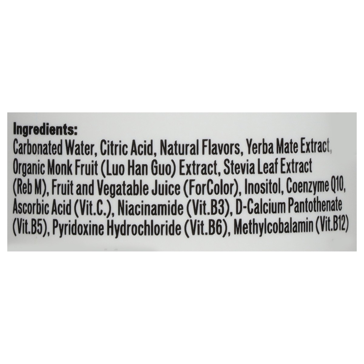 Carbonated Water, Citric Acid, Natural Flavors, Yerba Mate Extract, Organic Monk Fruit (Luo Han Guo) Extract, Stevia Leaf Extract (Reb M), Fruit and Vegatable Juice (Forcolor), Inositol, Coenzyme Q10,…