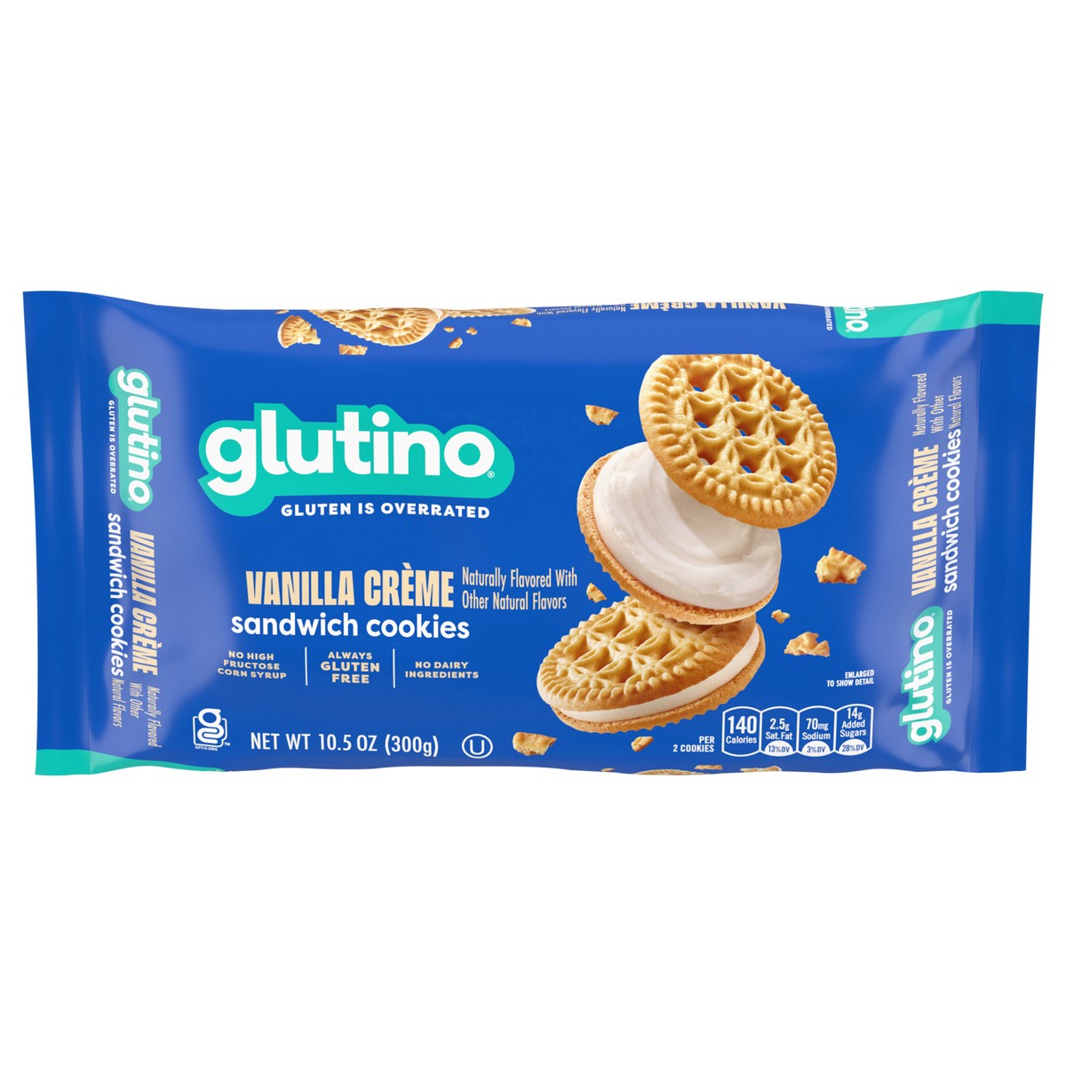 - One 10.5 oz. pack of Glutino Gluten Free Vanilla Crème Flavored Sandwich Cookies