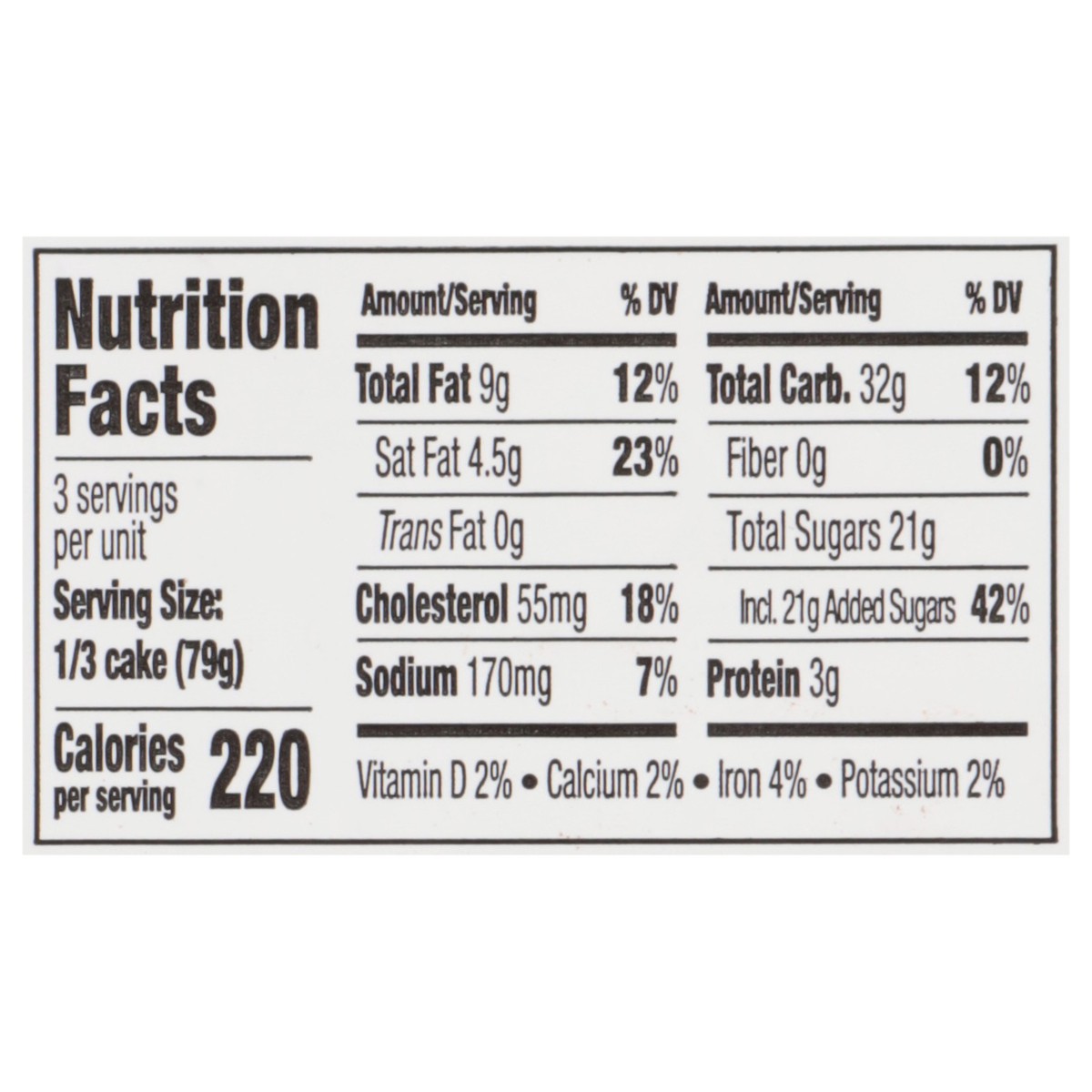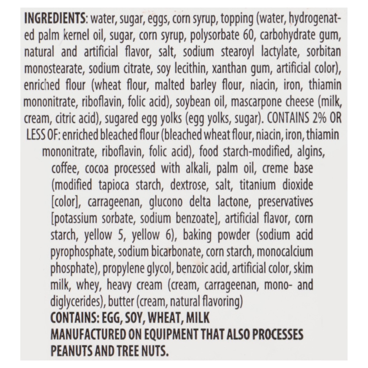 Water, Sugar, Eggs, Corn Syrup, Topping (Water, Hydrogenated Palm Kernel Oil, Sugar, Corn Syrup, Polysorbate 60, Carbohydrate Gum, Natural and Artificial Flavor, Salt, Sodium Stearoyl Lactylate, Sorbi…