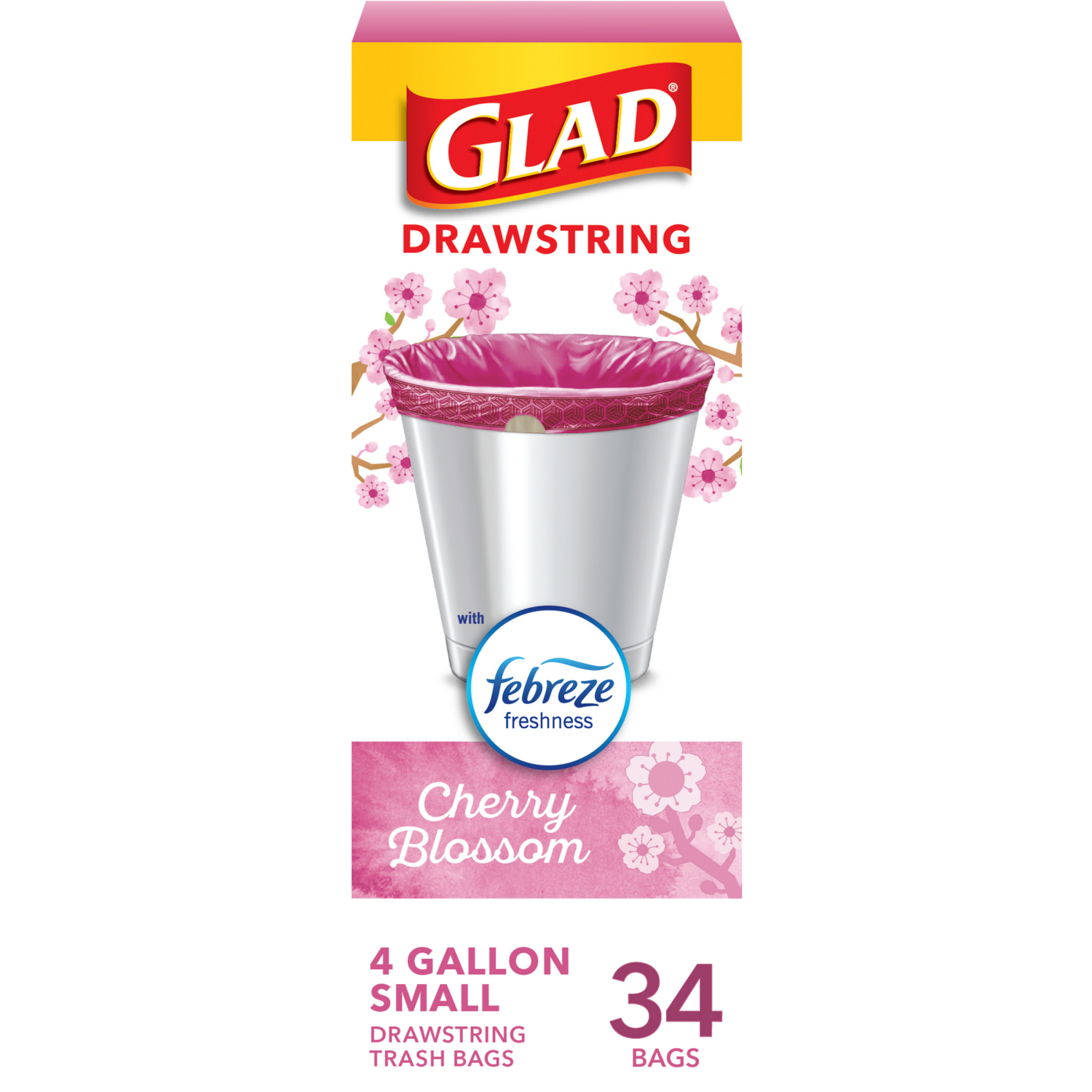 Glad OdorShield Small Drawstring Trash Bags, 4 Gallon Trash Bag, Febreze Cherry Blossom, 34 Count