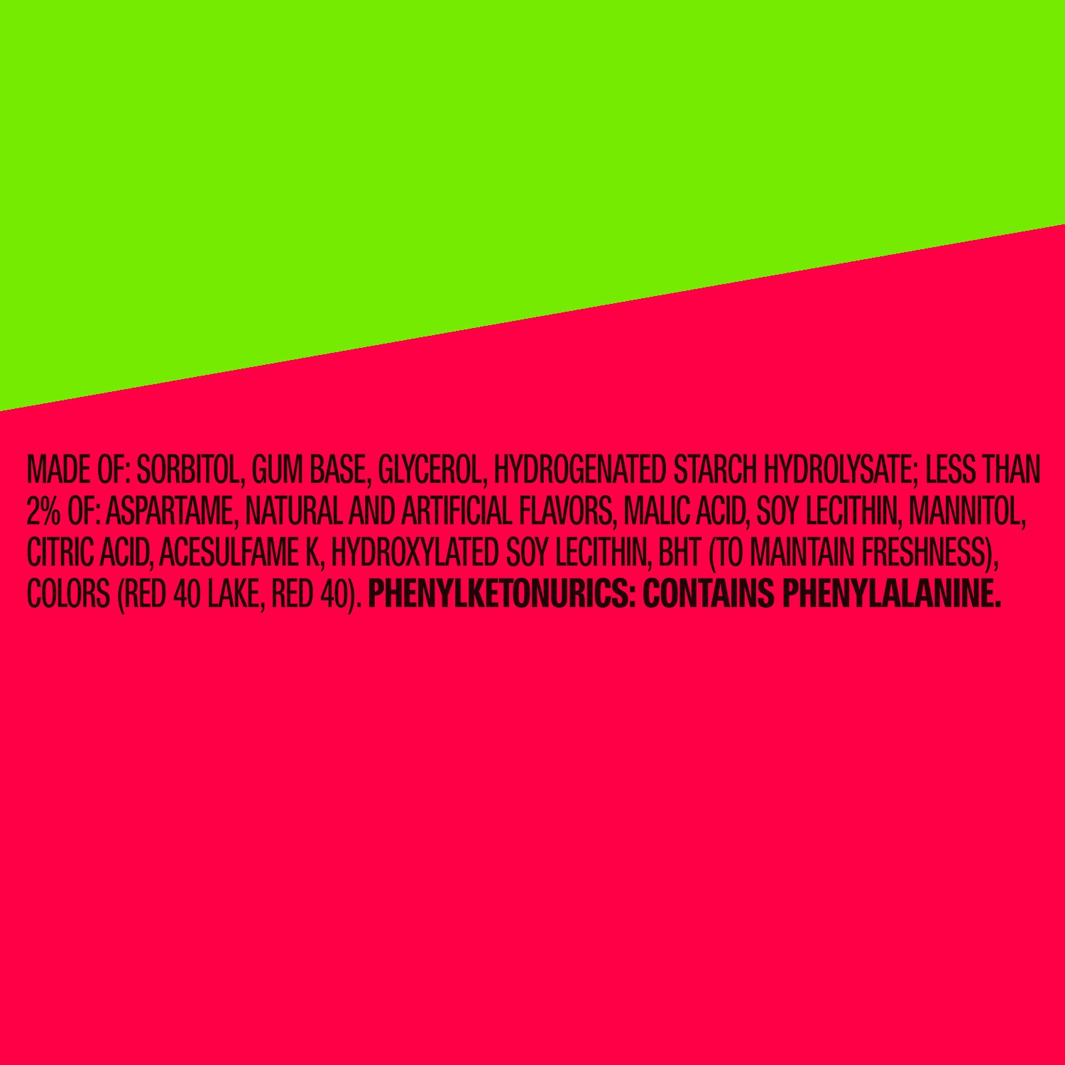 Made of: Sorbitol, Gum Base, Glycerol, Hydrogenated Starch Hydrolysate; Less than 2% of: Aspartame, Natural and Artificial Flavors, Malic Acid, Soy Lecithin, Mannitol, Citric Acid, Acesulfame K, Hydro…