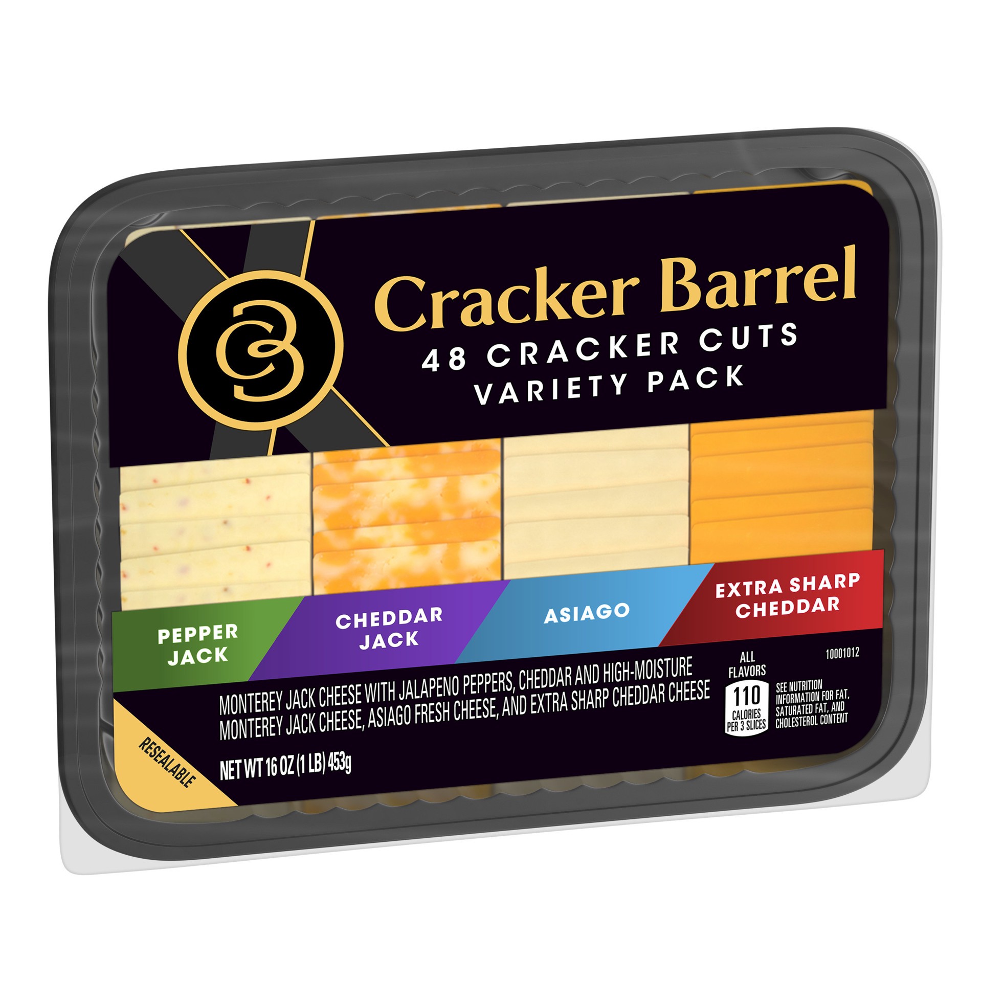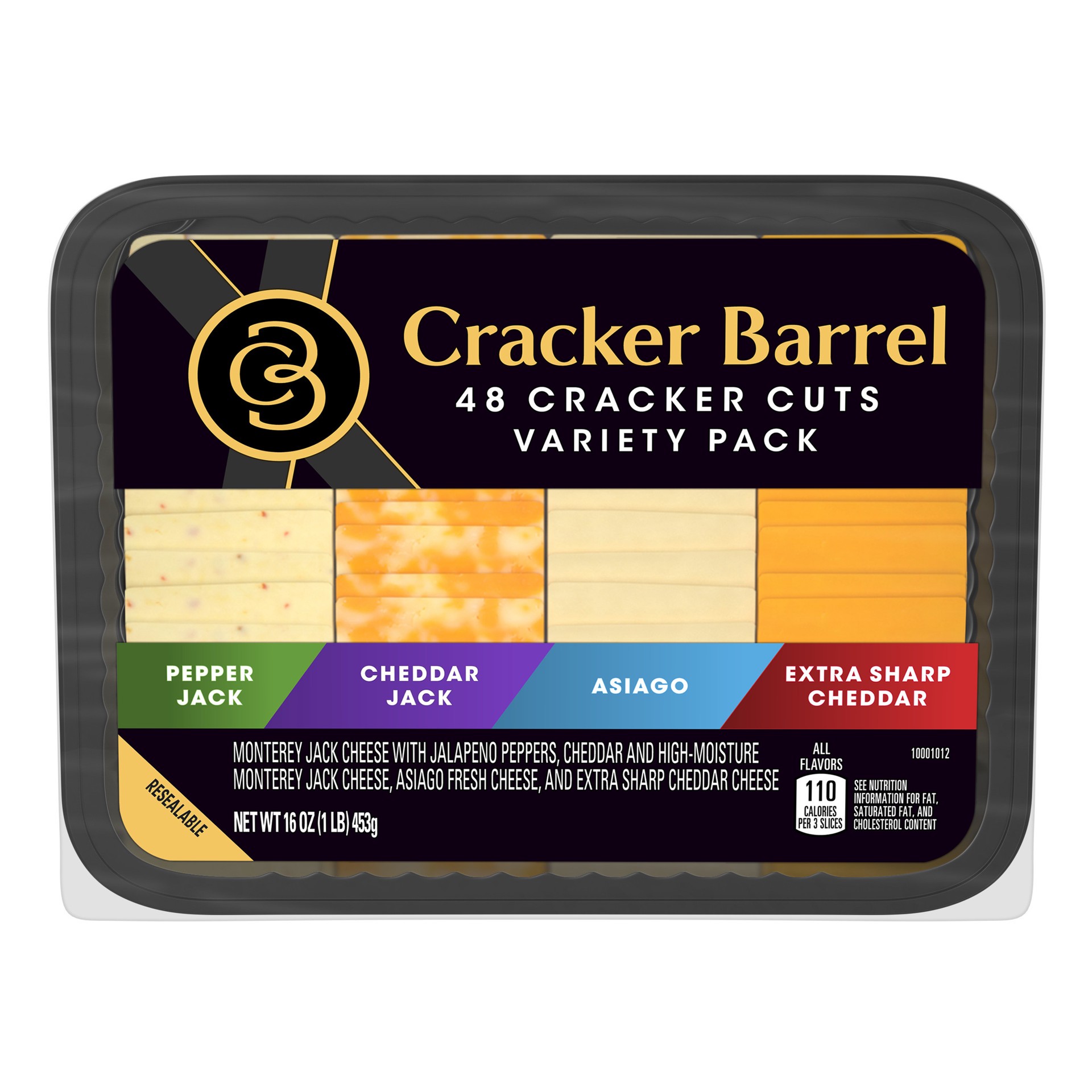 Cracker Barrel Cracker Cuts Variety Cheese Slice Pack serves up four varieties of delicious, flavorful cheeses in one convenient package. Featuring pepper jack, cheddar jack, Asiago and extra sharp ch…