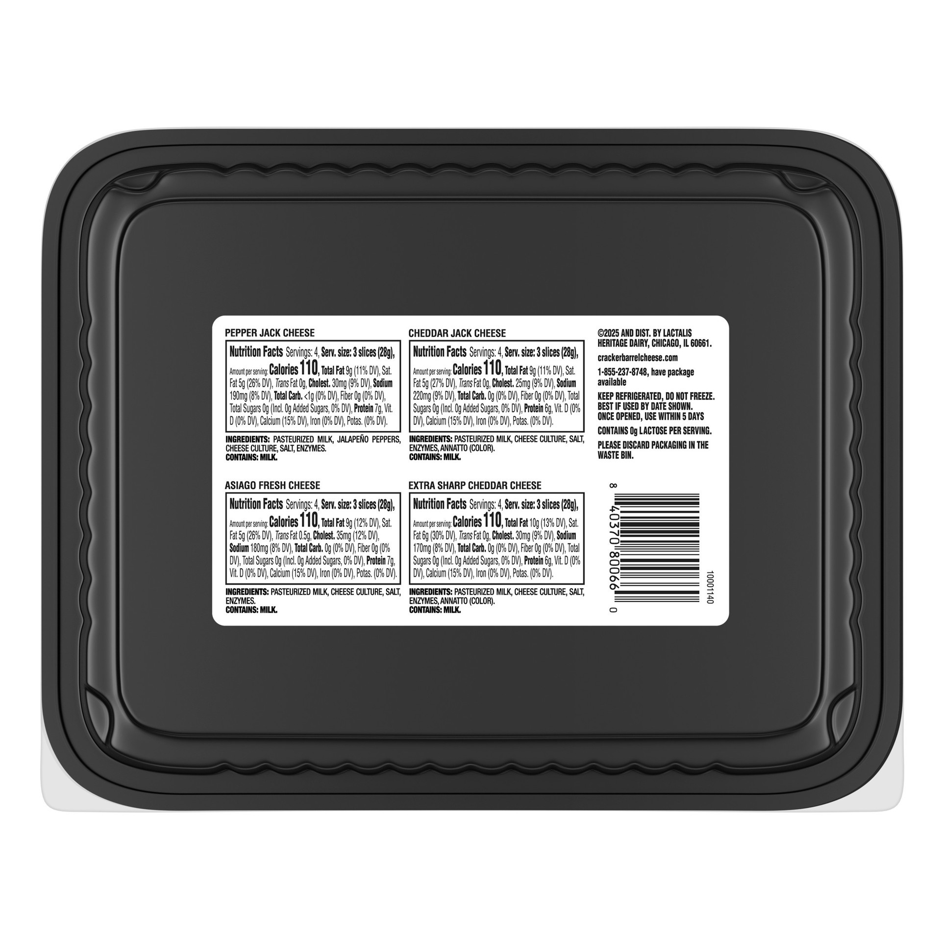 PEPPER JACK CHEESE: PASTEURIZED MILK, JALAPENO PEPPERS, CHEESE CULTURE, SALT, ENZYMES.CHEDDAR JACK CHEESE: PASTEURIZED MILK, CHEESE CULTURE, SALT, ENZYMES, ANNATTO (COLOR).ASIAGO FRESH CHEESE: PASTEUR…