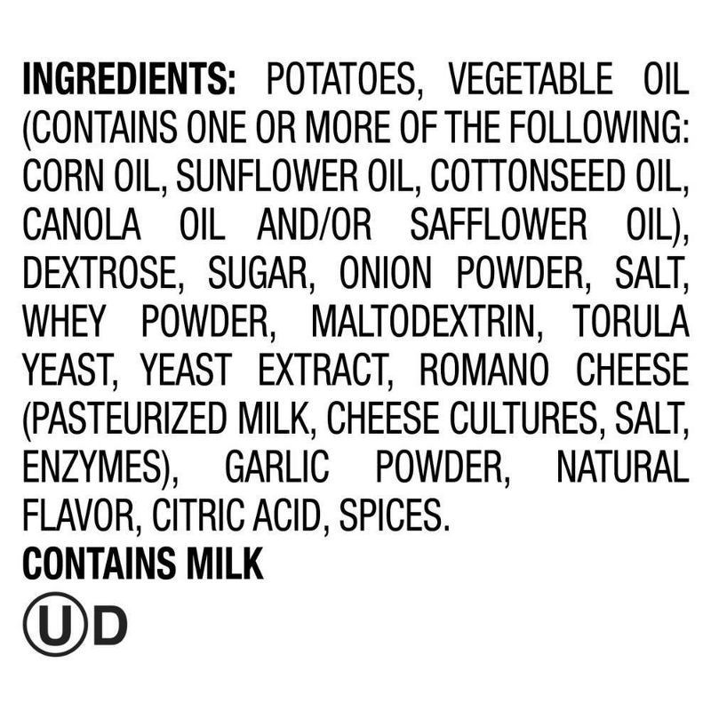 Potatoes, Vegetable Oil (Contains One or More of the Following: Corn Oil, Sunflower Oil, Cottonseed Oil, Canola Oil and/or Safflower Oil), Dextrose, Sugar, Onion Powder, Salt, Whey Powder, Maltodextri…