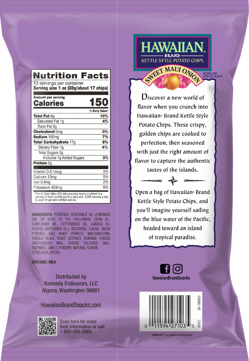Crispy & crunchy. Not a product of Hawaii. Discover a new world of flavor when you crunch into Hawaiian Brand Kettle Style Potato Chips. These crispy, golden chips are cooked to perfection, then seaso…