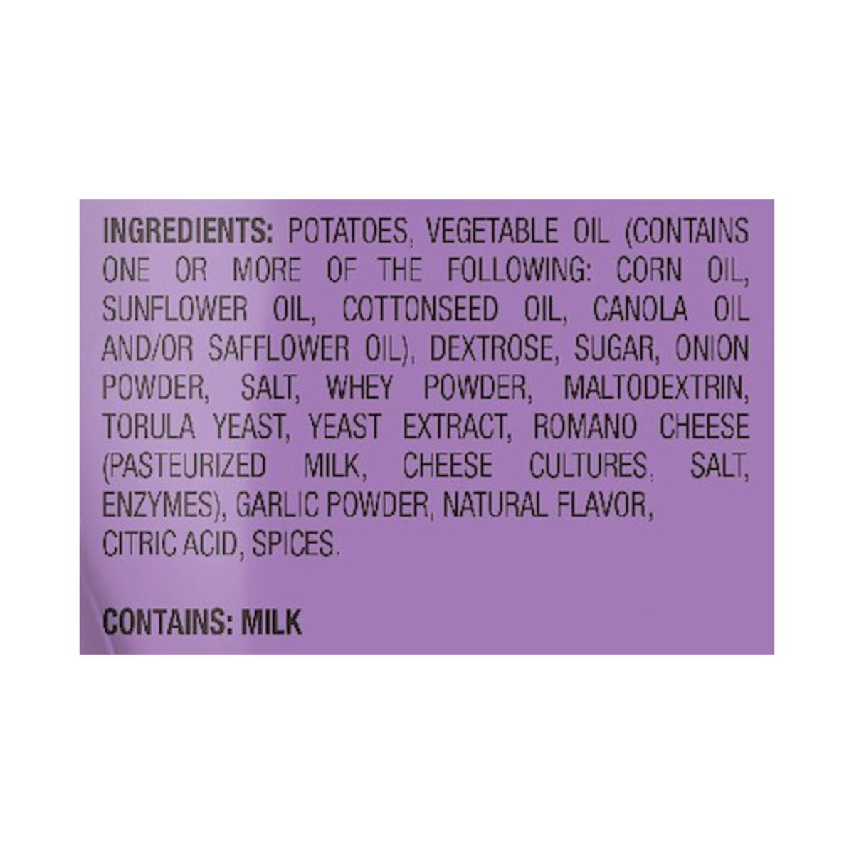 Potatoes, Vegetable Oil (Contains One or More of the Following: Corn Oil, Sunflower Oil, Cottonseed Oil, Canola Oil and/or Safflower Oil), Dextrose, Sugar, Onion Powder, Salt, Whey Powder, Maltodextri…