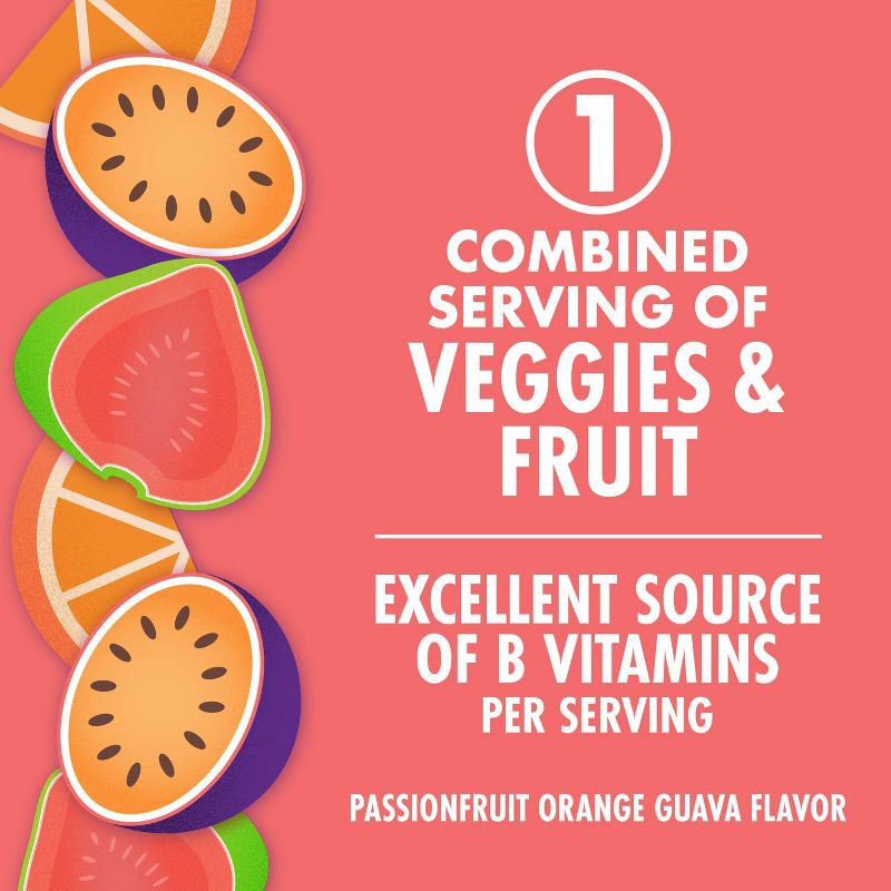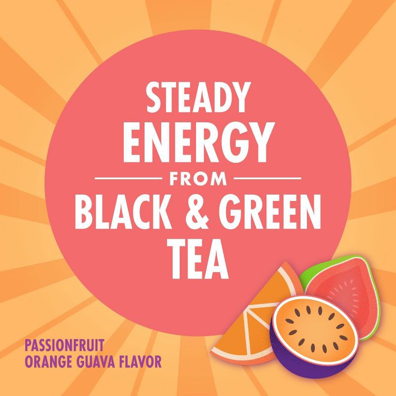 - A passionfruit, orange and guava flavored fruit and vegetable juice blend infused with natural energy from black and green tea