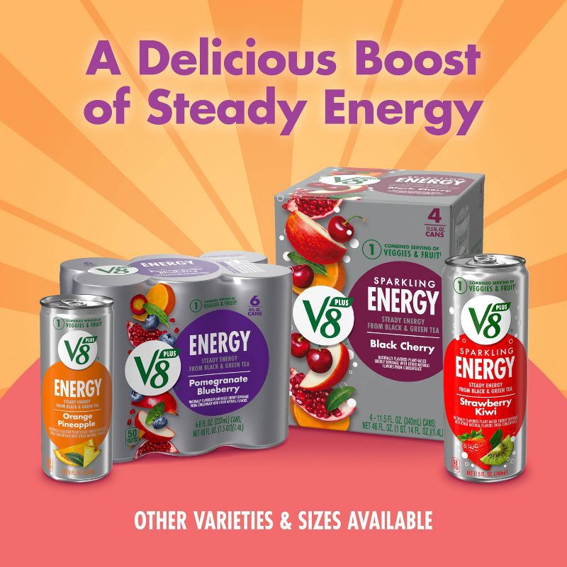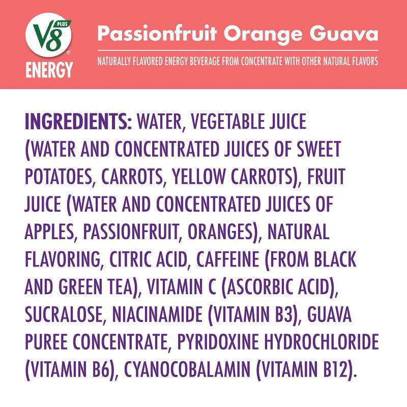 - Six (6) 8 fl oz cans of V8 +Energy Passionfruit Orange Guava Juice Energy Drink