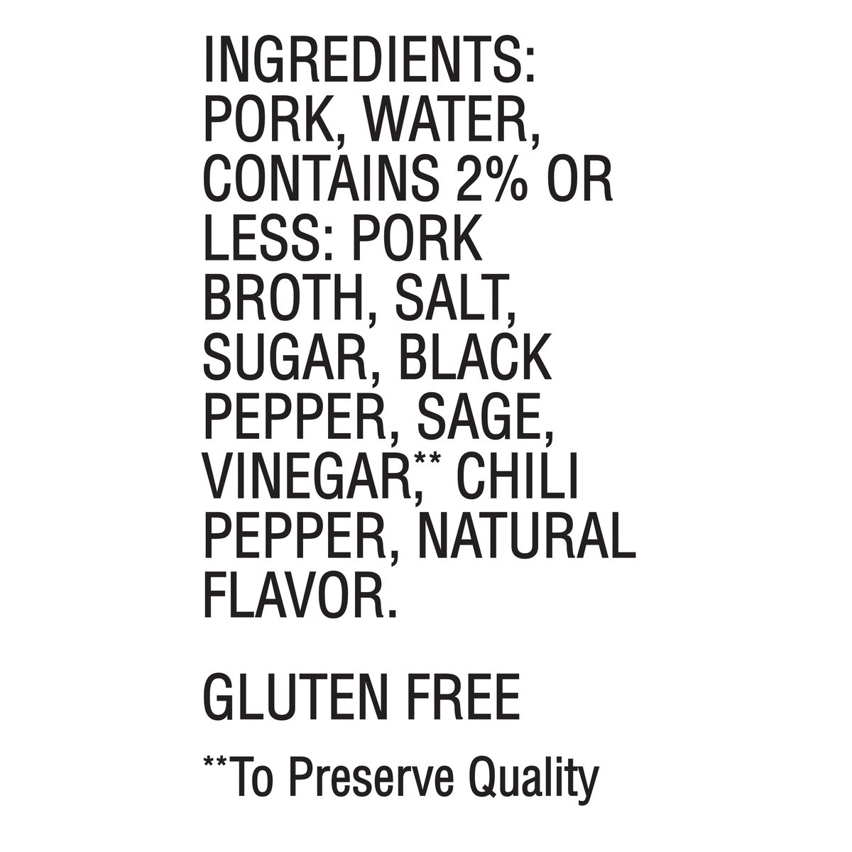Pork, Water, Contains 2% or less of: Pork Broth, Salt, Natural Flavor, Sugar, Vinegar**. **To Preserve Quality.
