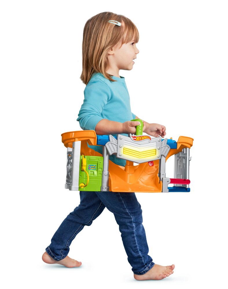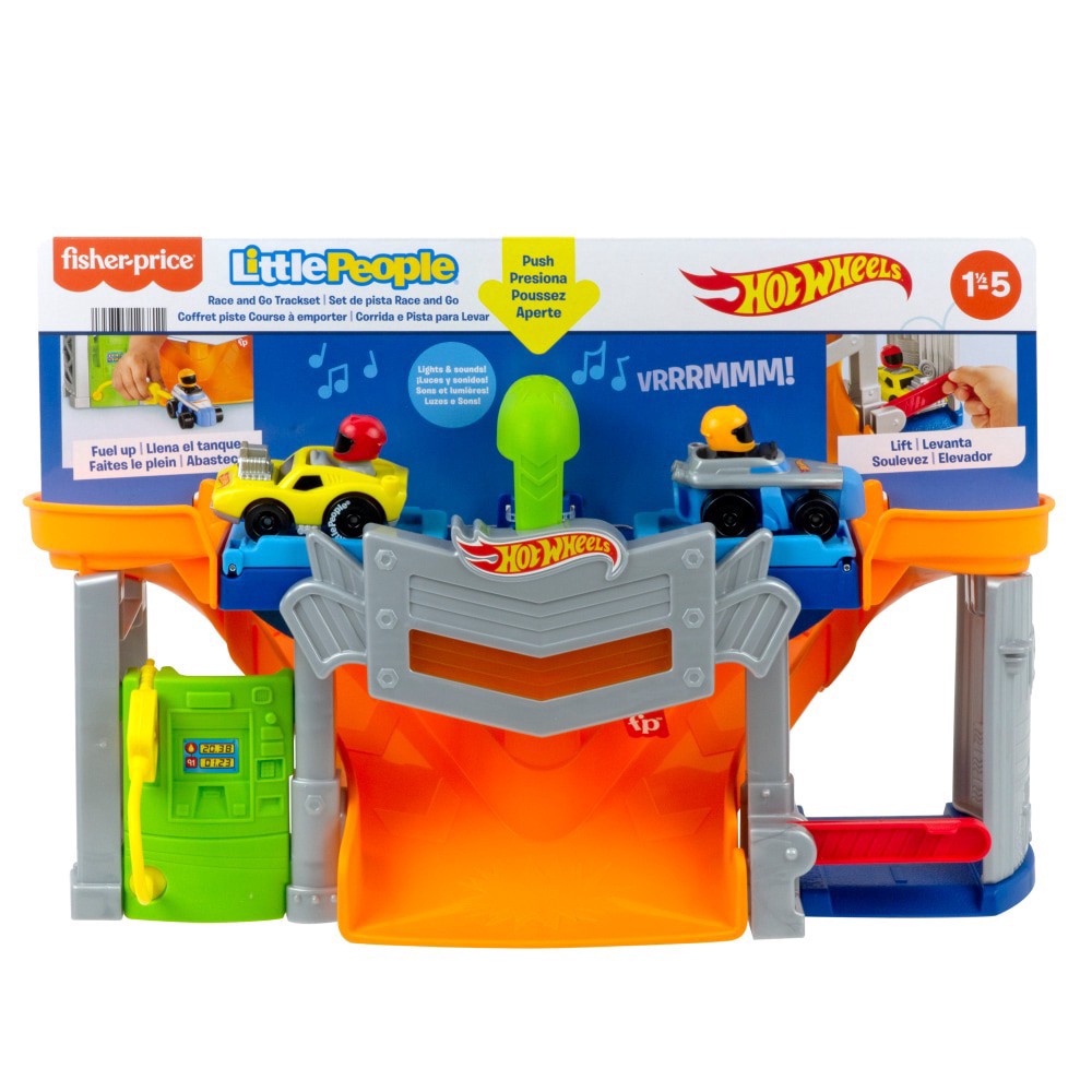 Toddlers can create their own cool Hot Wheels racing adventures with this Little People Race and Go Trackset from Fisher-Price. A press of the handle sends the Wheelies race cars zooming down and arou…
