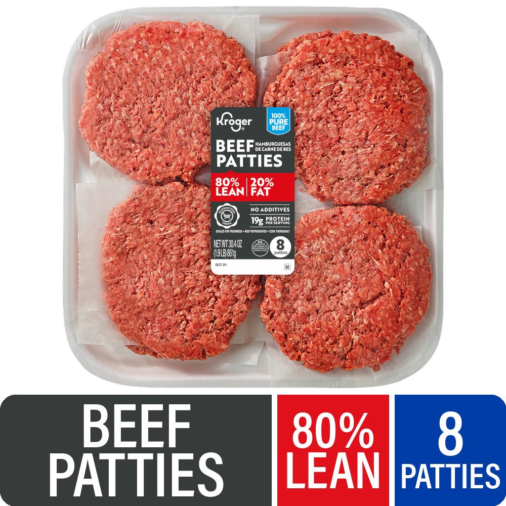 Kroger® 80/20 Ground Beef Patties burst with bold flavor, ready to sizzle on your grill! Containing 20g of protein per serving, these tasty patties have an 80% lean, 20% fat ratio for a delicious bala…