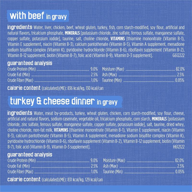 WITH BEEF in gravy - Water, liver chicken, beef, wheat gluten, turkey, fish, corn starch-modified, soy flour, artificial and natural flavors, tricalcium phosphate, MINERALS [potassium chloride, zinc s…
