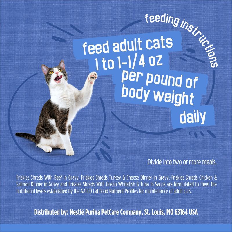 - Soft cat food checked for quality and safety to provide added peace of mind. Friskies wet cat food shreds formulated to meet or exceed industry standards for pet food