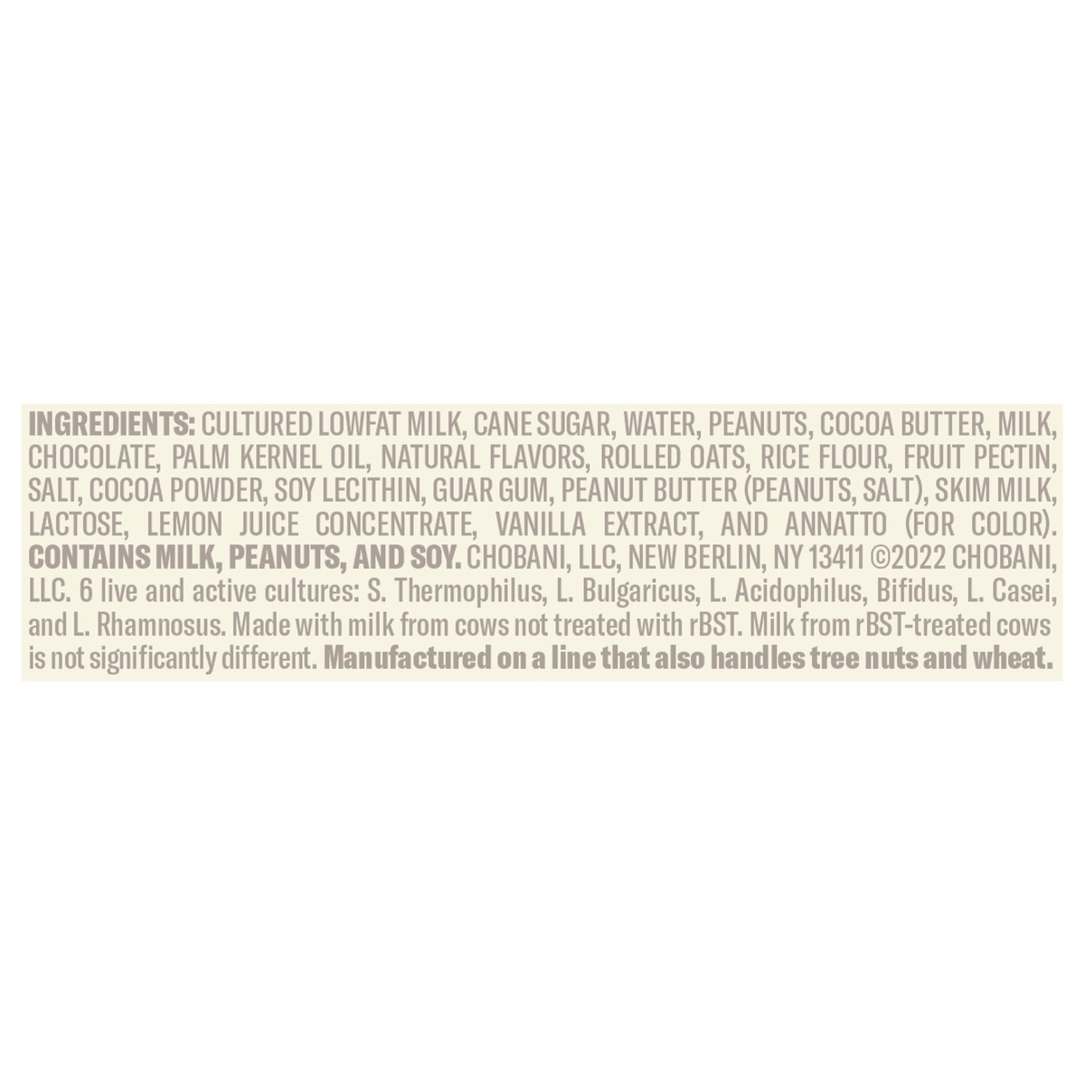 Cultured Lowfat Milk, Cane Sugar, Water, Peanuts, Cocoa Butter, Milk, Chocolate, Palm Kernel Oil, Natural Flavors, Rolled Oats, Rice Flour, Fruit Pectin, Salt, Cocoa Powder, Soy Lecithin, Guar Gum, Pe…