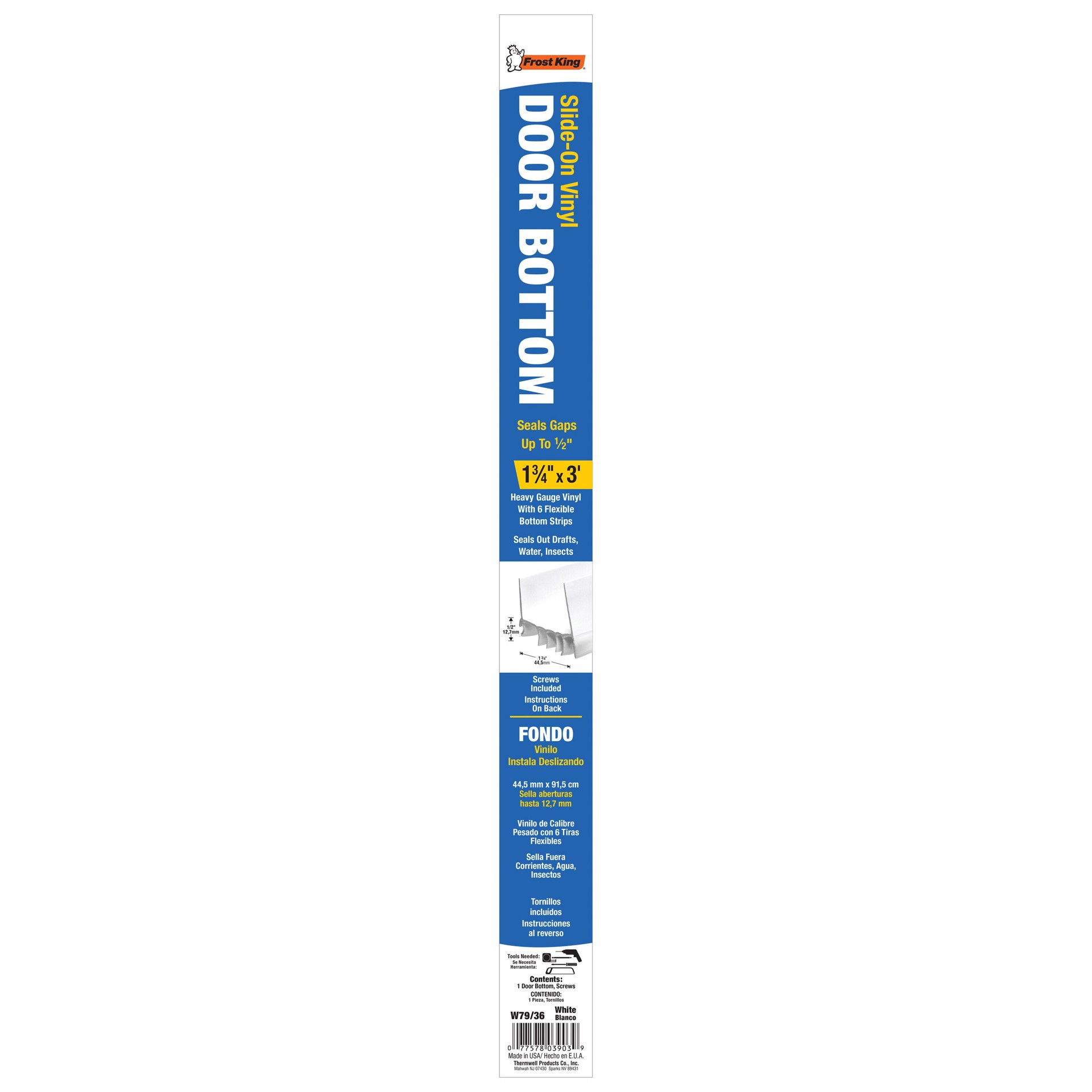 Seals gaps up to 1/2-in. U-shaped, so they slide easily on to aluminum or steel doors 1-3/4-in thick. Heavy gauge vinyl with six flexible bottom strips. Seals out drafts, water and insects. Screws inc…
