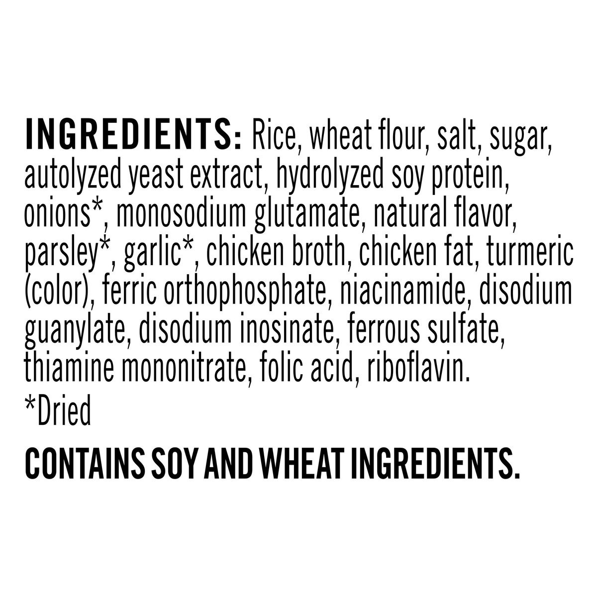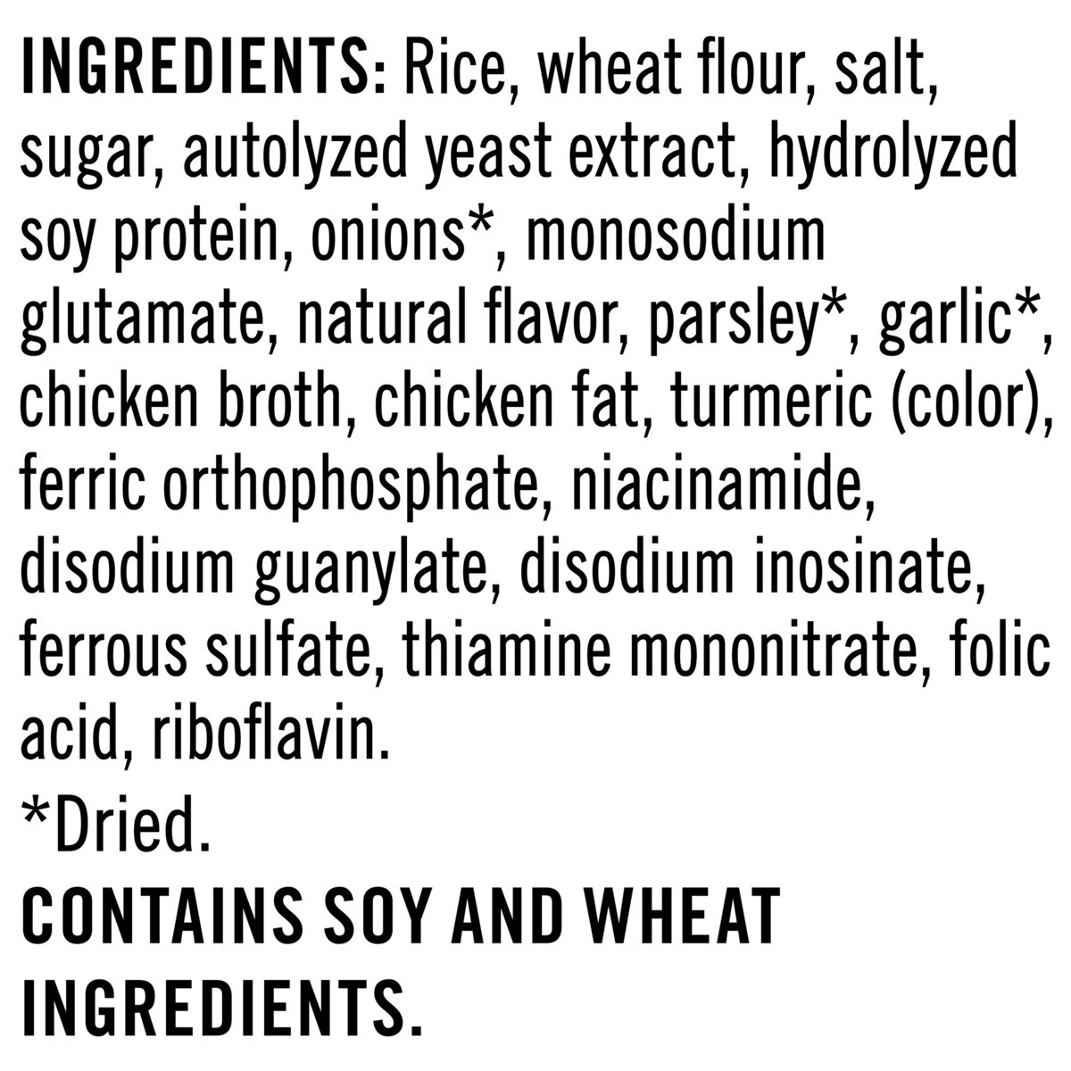 RICE, WHEAT FLOUR, SALT, SUGAR, AUTOLYZED YEAST EXTRACT, HYDROLYZED SOY PROTEIN, ONIONS*, MONOSODIUM GLUTAMATE, NATURAL FLAVOR, PARSLEY*, GARLIC*, CHICKEN BROTH, CHICKEN FAT, TURMERIC (COLOR), FERRIC …