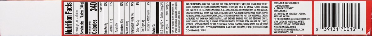 Crust: Rice Flour (Rice, Rice Bran), Tapioca Starch, Water, Rice Starch, Modified Rice Starch, Powdered Whey (a Milk Derivative), Vegetable Shortening (Palm Oil, Natural Flavor), Contains Less than 2%…