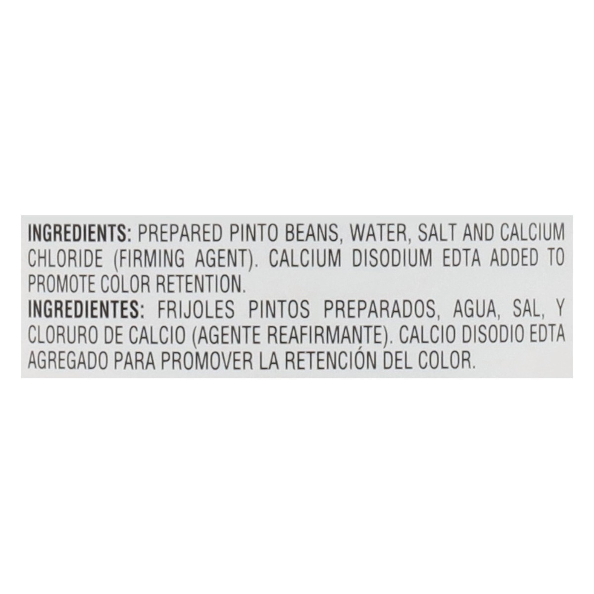 Prepared Pinto Beans, Water, Salt And Calcium Chloride (Firming Agent). Calcium Disodium Edta Added To Promote Color Retention.
