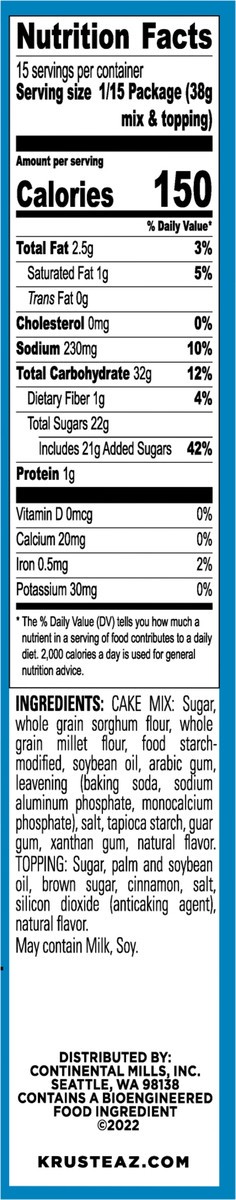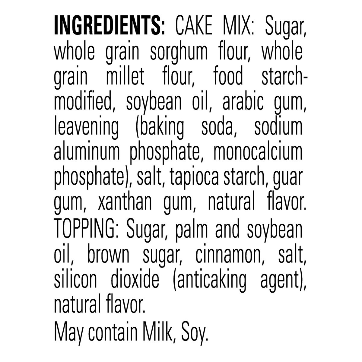 Cake Mix: Sugar, Whole Grain Sorghum Flour, Whole Grain Millet Flour, Food Starch-Modified, Soybean Oil, Arabic Gum, Leavening (Baking Soda, Sodium Aluminum Phosphate, Monocalcium Phosphate), Salt, Ta…