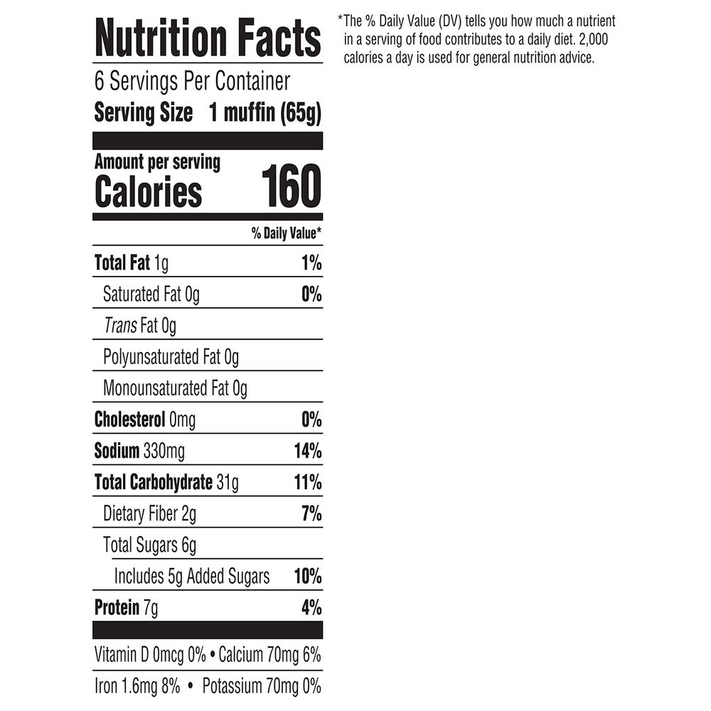 No artificial preservatives, colors or flavors. No high fructose corn syrup. Per 1 Muffin Serving: 160 calories; 0 g sat fat (0% DV); 320 sodium (14% DV); 6 g total sugars. USDA Organic. Certified Org…