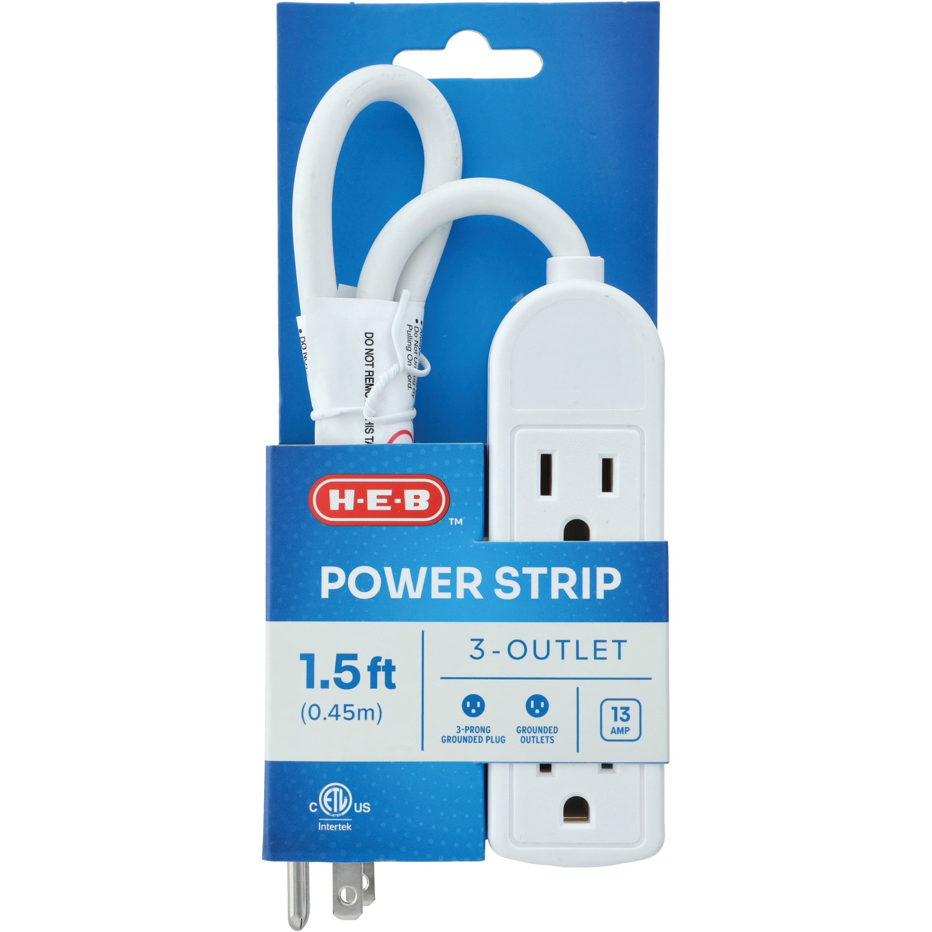 H-E-B 3 Outlet White Power Strip. Length: 1.5 feet