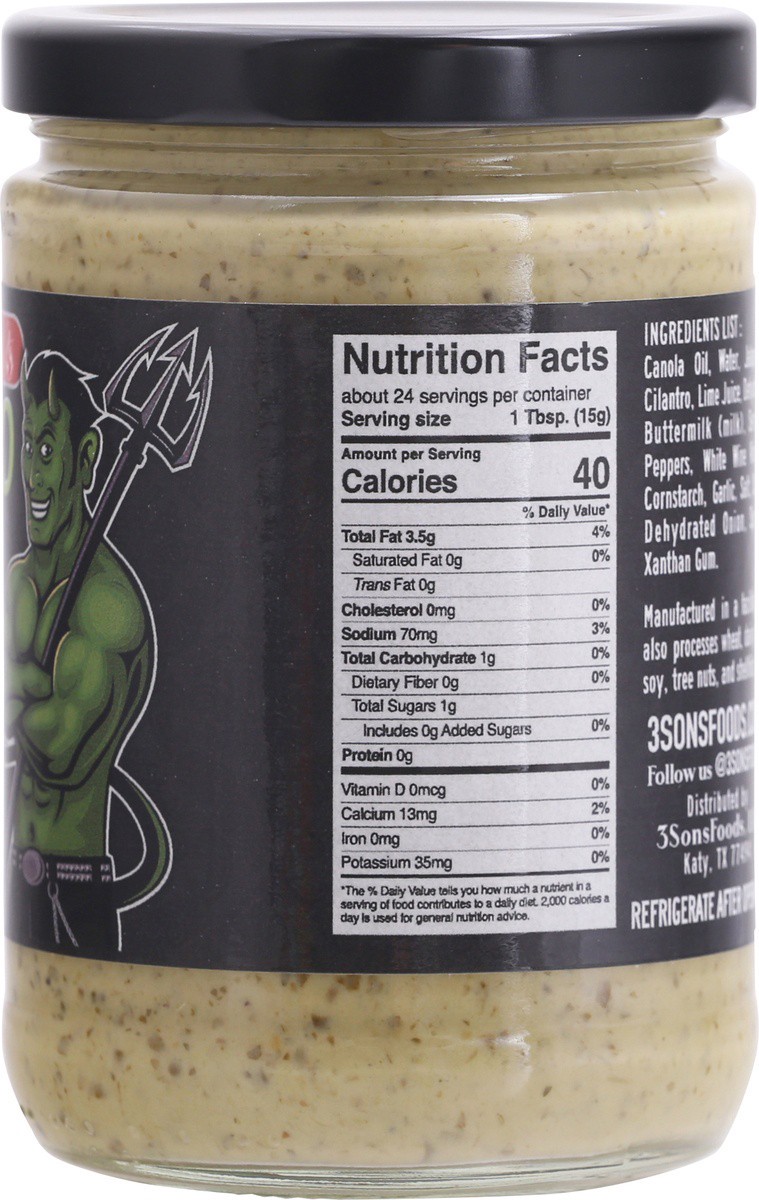 Canola Oil, Water, Jalapenos, Cilantro, Lime Juice, Dehydrated Buttermilk (Milk), Serrano Peppers, White Wine Vinegar, Cornstarch, Garlic, Salt, Sugar, Dehydrated Onion, Spices, Xanthan Gum.