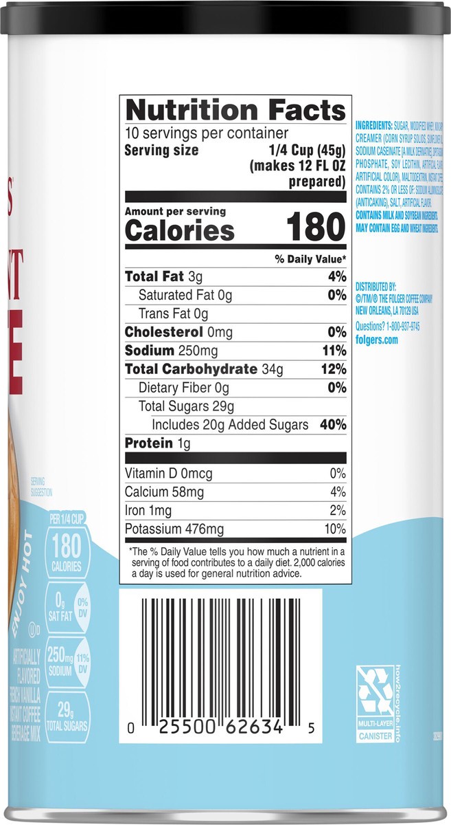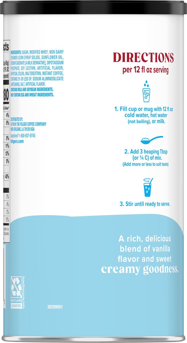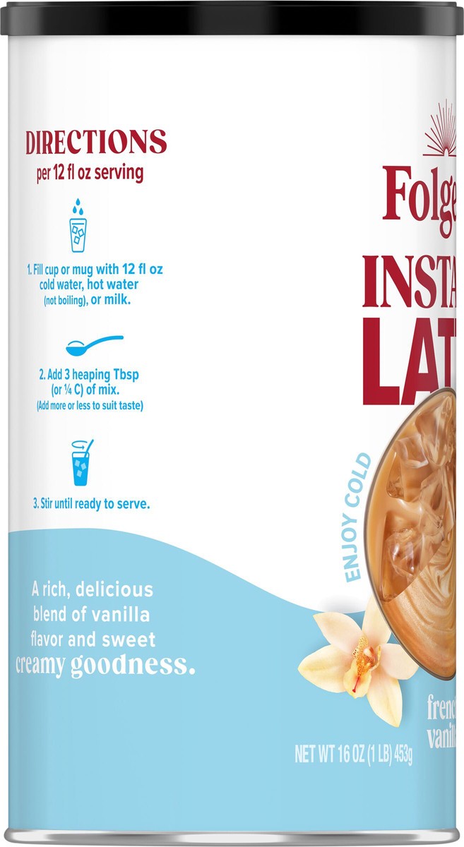 - CONTAINS: One 16-ounce canister of Folgers French Vanilla Artificially Flavored Latte Mix
