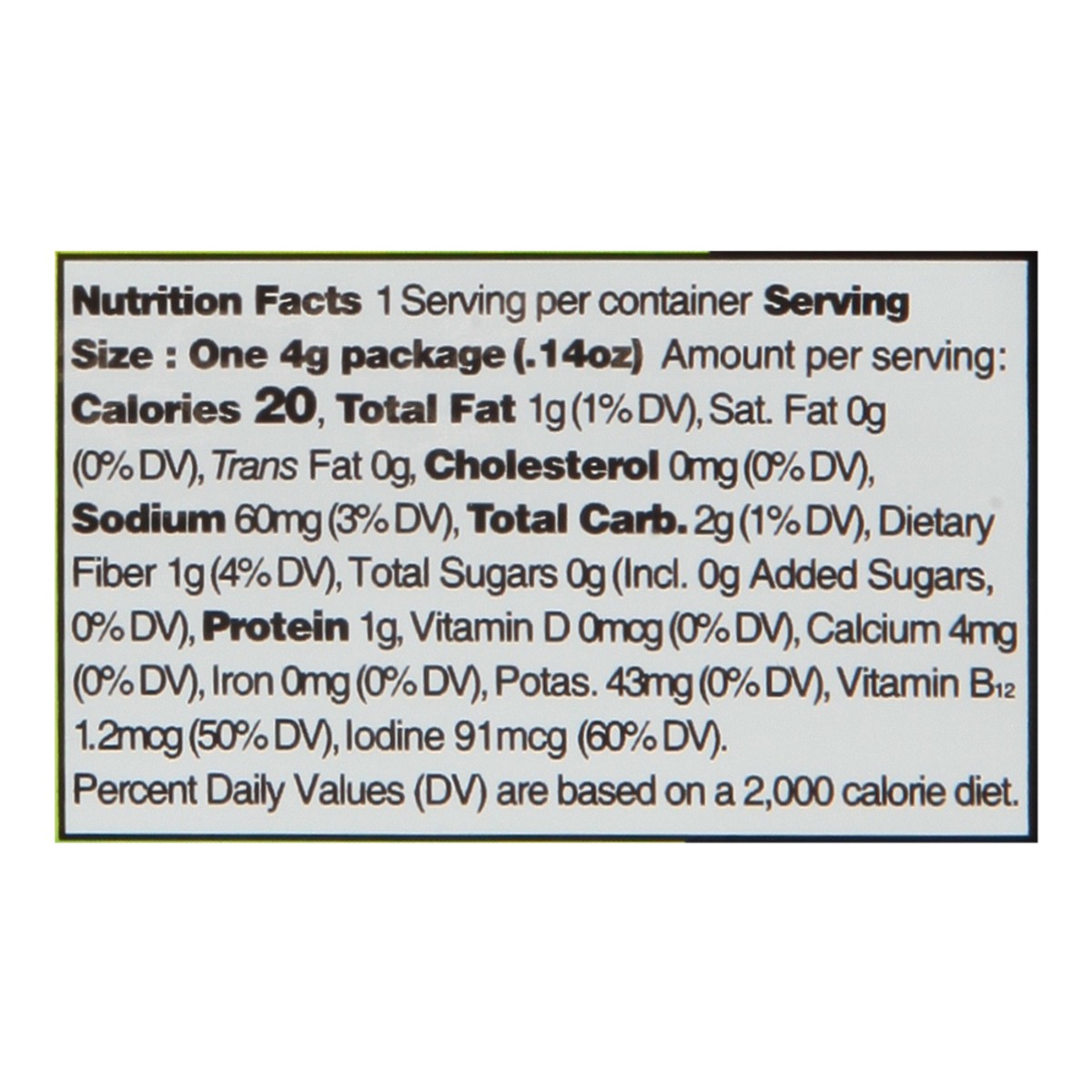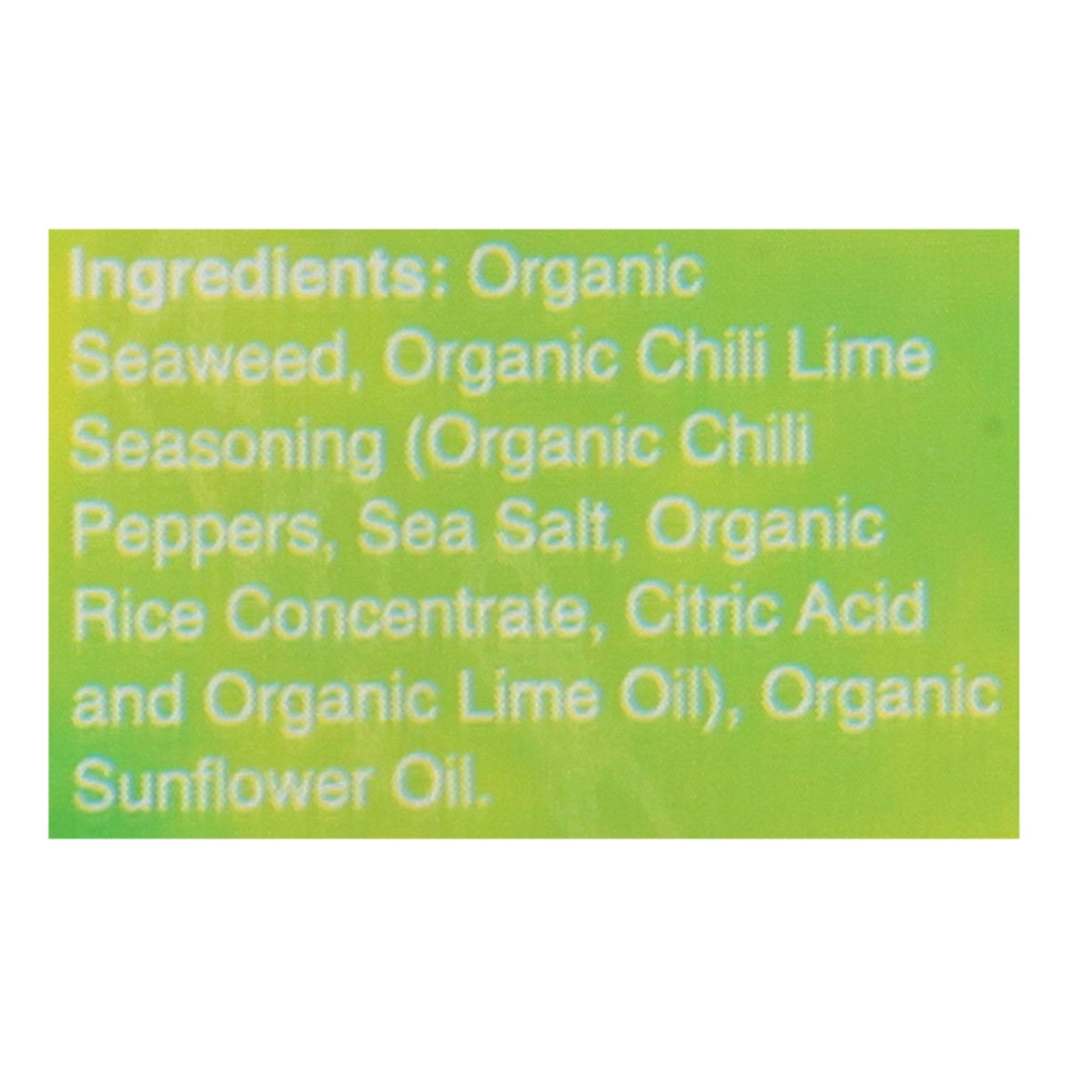 Organic Seaweed, Organic Chili Lime Seasoning (Organic Chili Peppers, Sea Salt, Organic Rice Concentrate, Citric Acid and Organic Lime Oil), Organic Sunflower Oil.