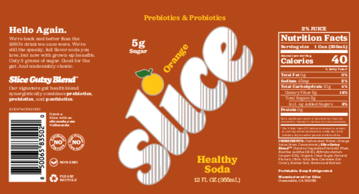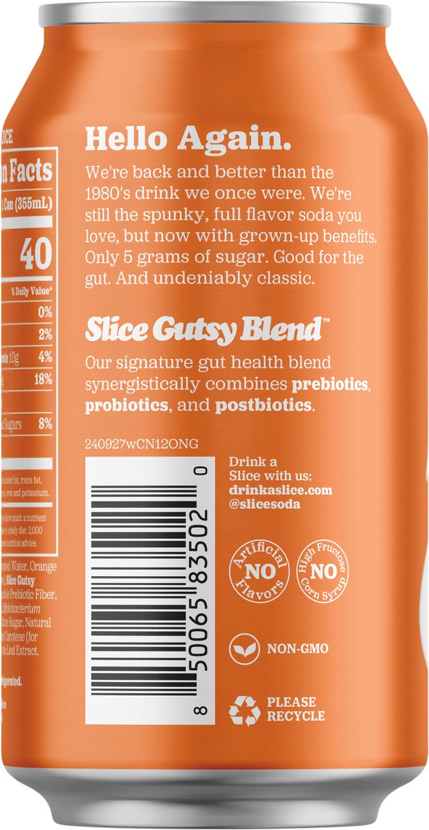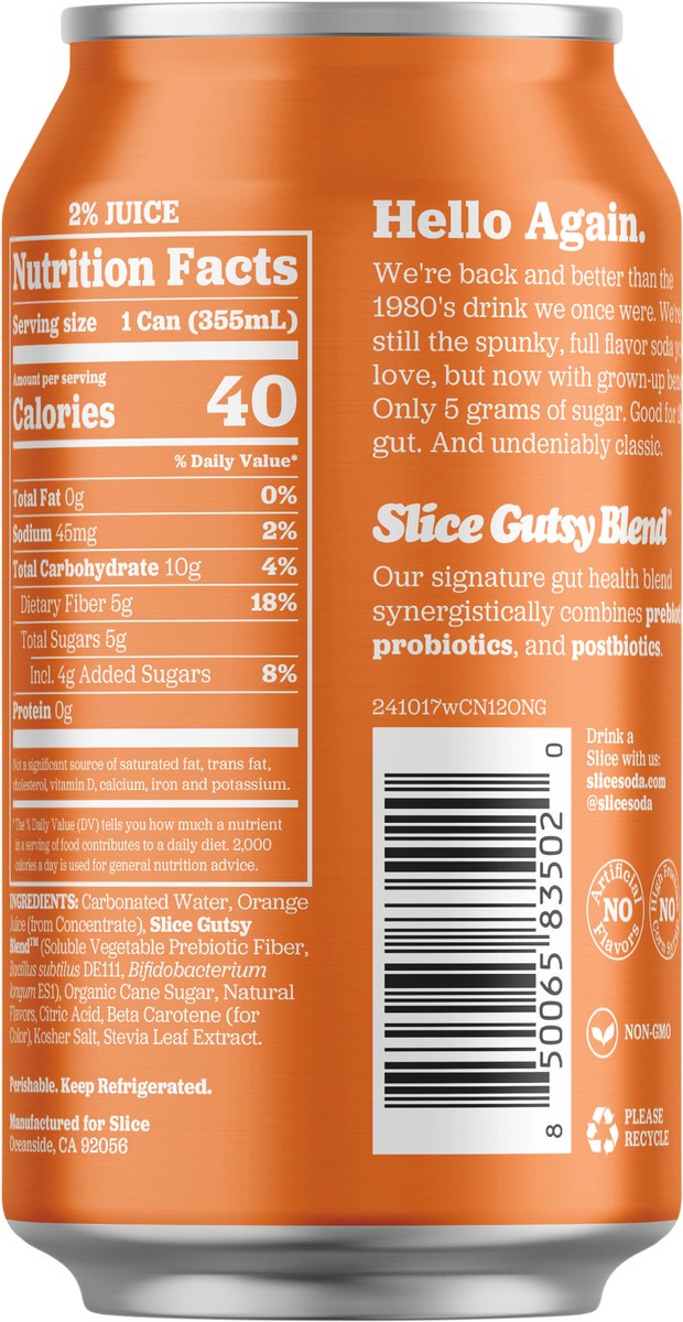 Slice is the spunky, full-flavored orange soda you loved as a kid, but now with grown-up benefits. This healthy soda contains probiotics, postbiotics and 5 grams of prebiotic fiber to support your dig…
