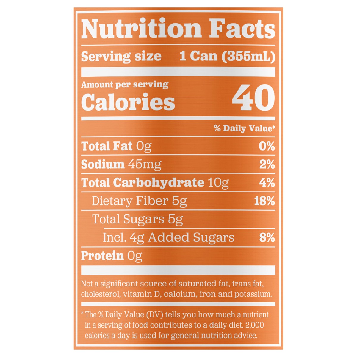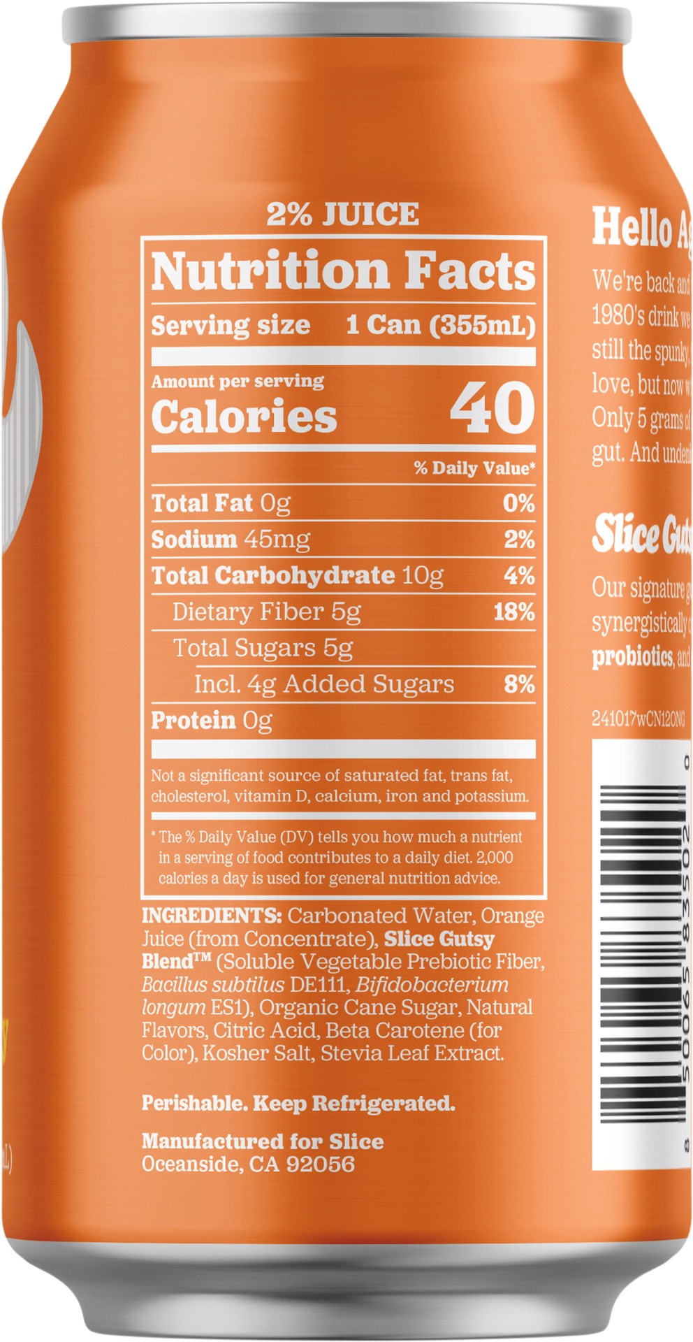 Carbonated Water, Orange Juice (from Concentrate), Slice Gutsy Blend TM(Soluble Vegetable Prebiotic Fiber, Bacillus subtilus DE111, Bifidobacterium longum ES1), Organic Cane Sugar, Natural Flavors, Ci…