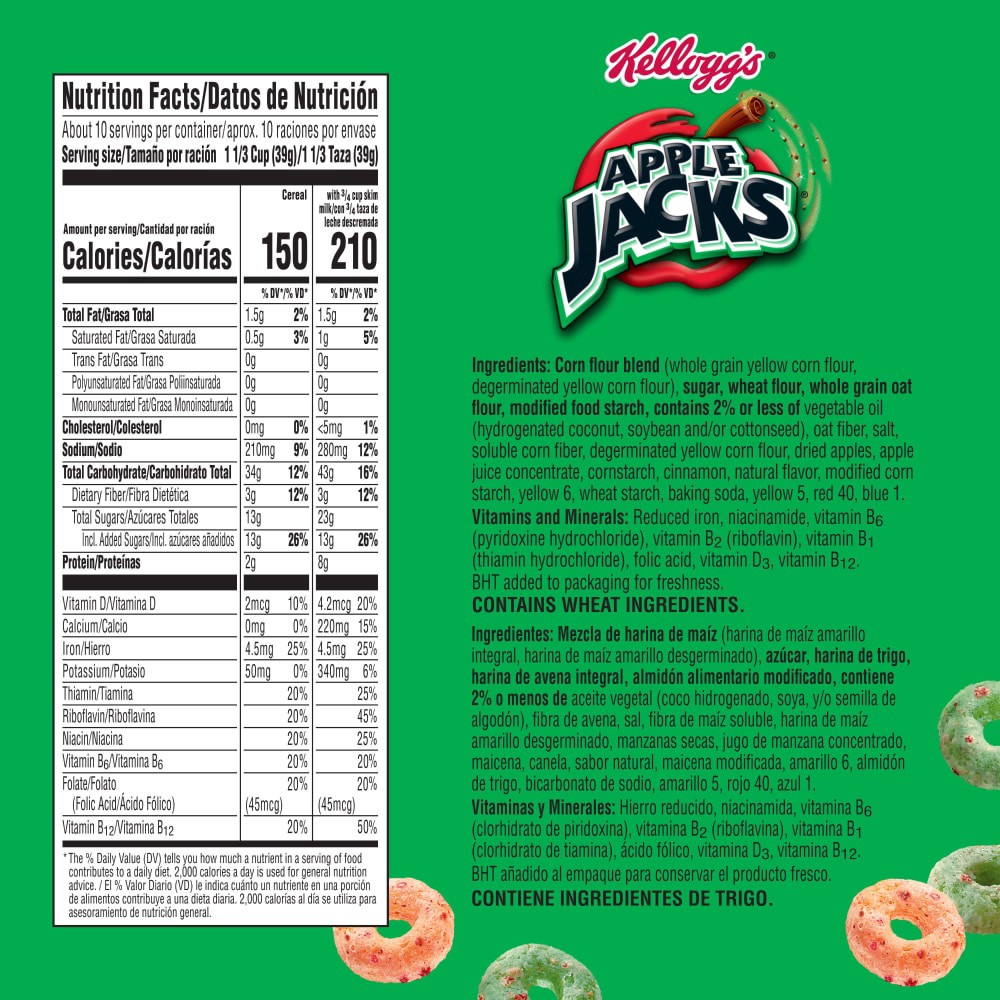 Start your day with Kellogg's Apple Jacks breakfast cereal and the crunch of delicious O's with the flavor of crisp apples and cinnamon. A low-fat breakfast cereal, Kellogg's Apple Jacks is a good sou…