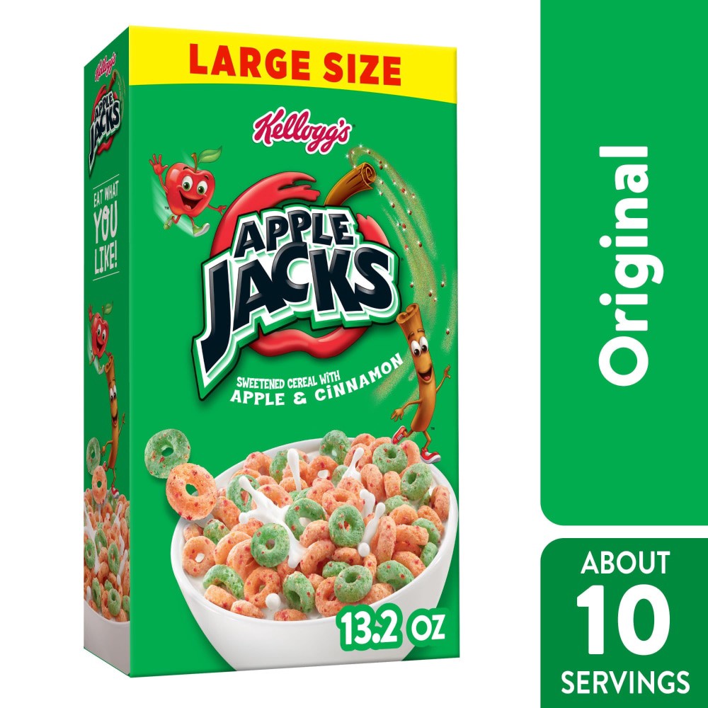 Start your day with Kellogg's Apple Jacks breakfast cereal and the crunch of delicious O's with the flavor of crisp apples and cinnamon. A low-fat breakfast cereal, Kellogg's Apple Jacks is a good sou…