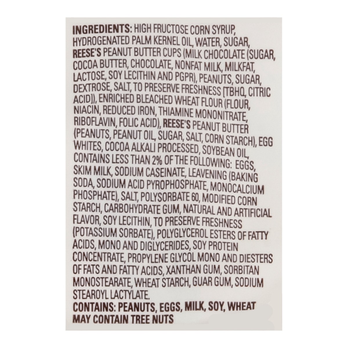 High Fructose Corn Syrup, Hydrogenated Palm Kernel Oil, Water, Sugar, Reese's Peanut Butter Cups (Milk Chocolate (Sugar, Cocoa Butter, Chocolate, Nonfat Milk, Milkfat, Lactose, Soy Lecithin and PGPR),…