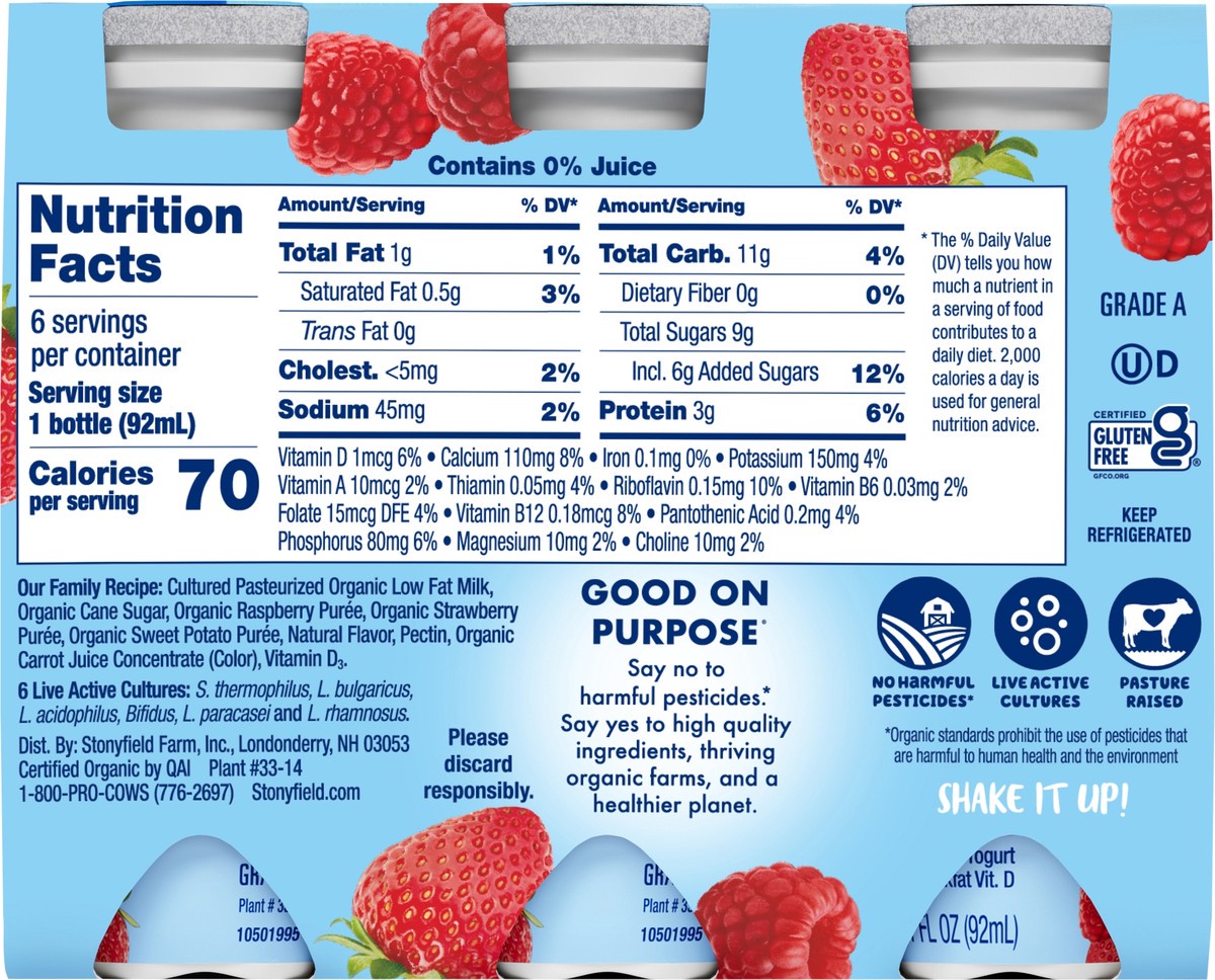 Our Family Recipe: Cultured Pasteurized Organic Low Fat Milk, Organic Cane Sugar, Organic Raspberry Puree, Organic Strawberry Puree, Organic Sweet Potato Puree, Natural Flavor, Pectin, Organic Carrot …
