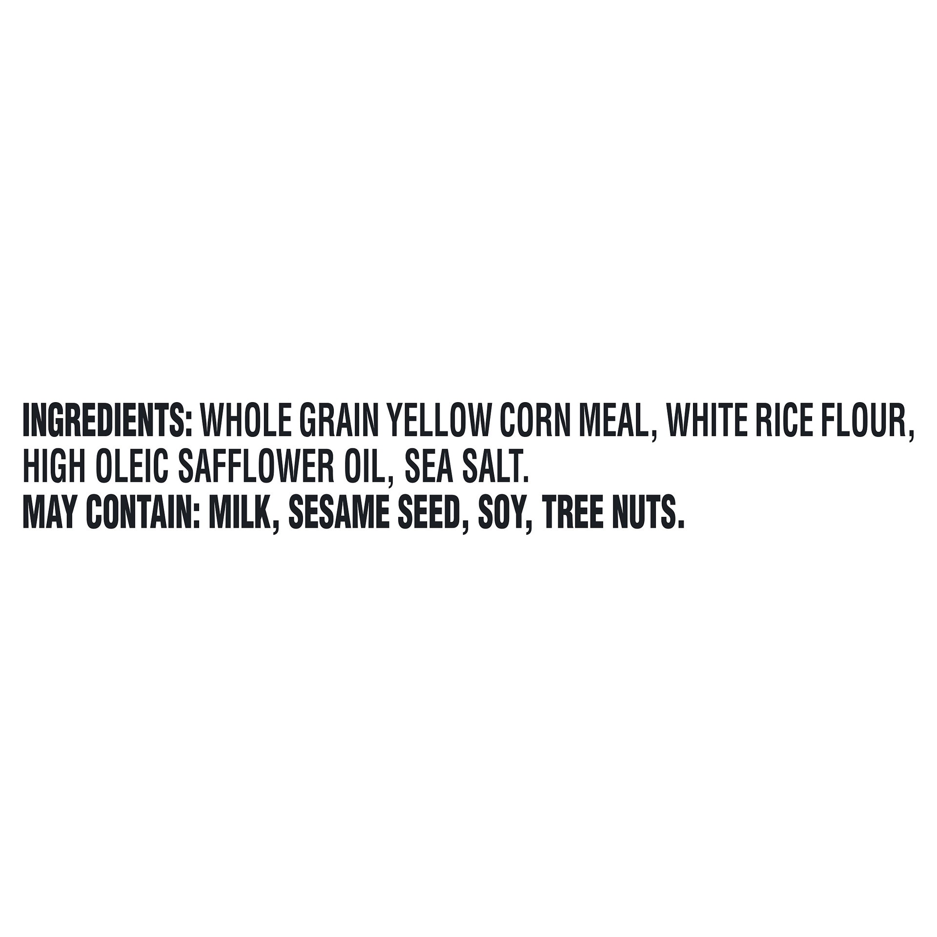 INGREDIENTS: WHOLE GRAIN YELLOW CORN MEAL, WHITE RICE FLOUR, HIGH OLEIC SAFFLOWER OIL, SEA SALT. MAY CONTAIN: MILK, SESAME SEED, SOY, TREE NUTS.