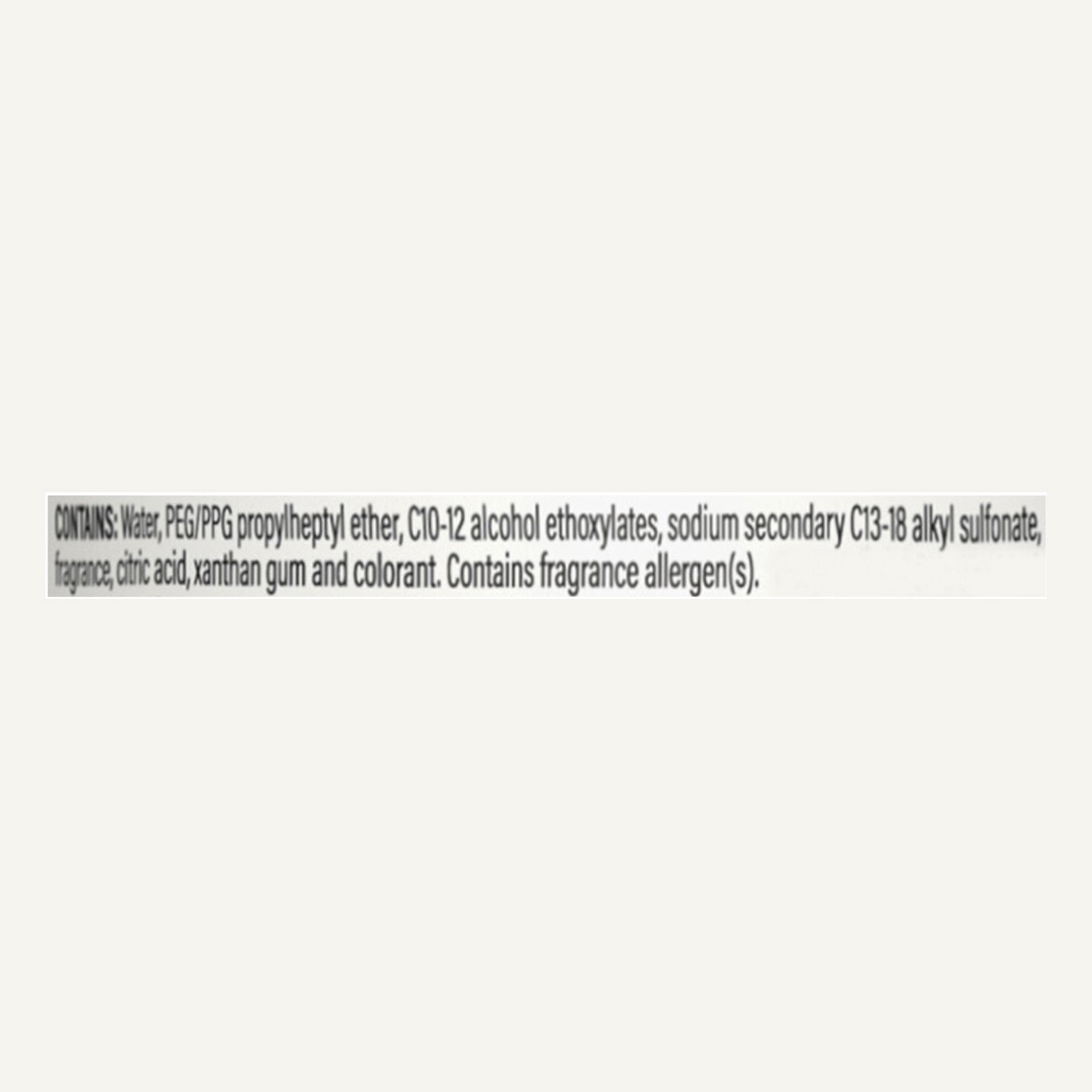 Contains: Water, PEG/PPG Propylheptyl Ether, C10-12 Alcohol Ethoxylates, Sodium Secondary C13-18 Alkyl Sulfonate, Fragrance, Citric Acid, Xanthan Gum and Colorant.