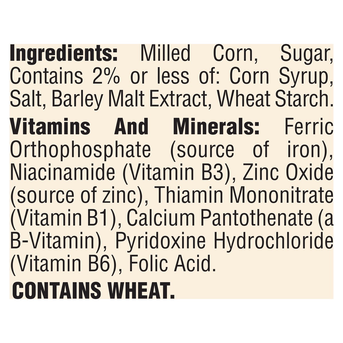 Milled Corn, Sugar, Contains 2% or Less of: Corn Syrup, Salt, Barley Malt Extract, Wheat Starch, Vitamins and Minerals: Ferric Orthophosphate (Source of Iron), Niacinamide (Vitamin B3), Zinc Oxide (So…