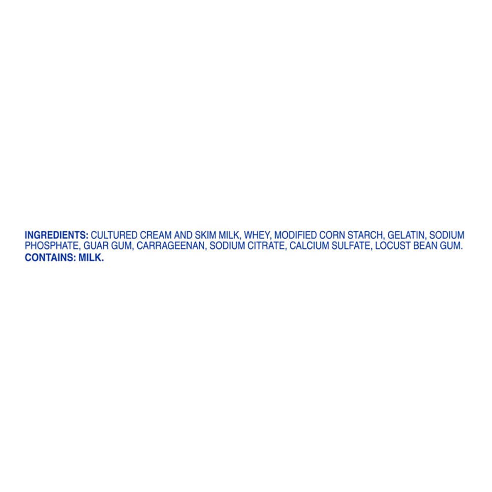 Ingredients: Cultured Cream And Skim Milk, Whey, Modified Corn Starch, Cultured Dextrose, Gelatin, Sodium Phosphate, Guar Gum, Carrageenan, Sodium Citrate, Calcium Sulfate, Locust Bean Gum.