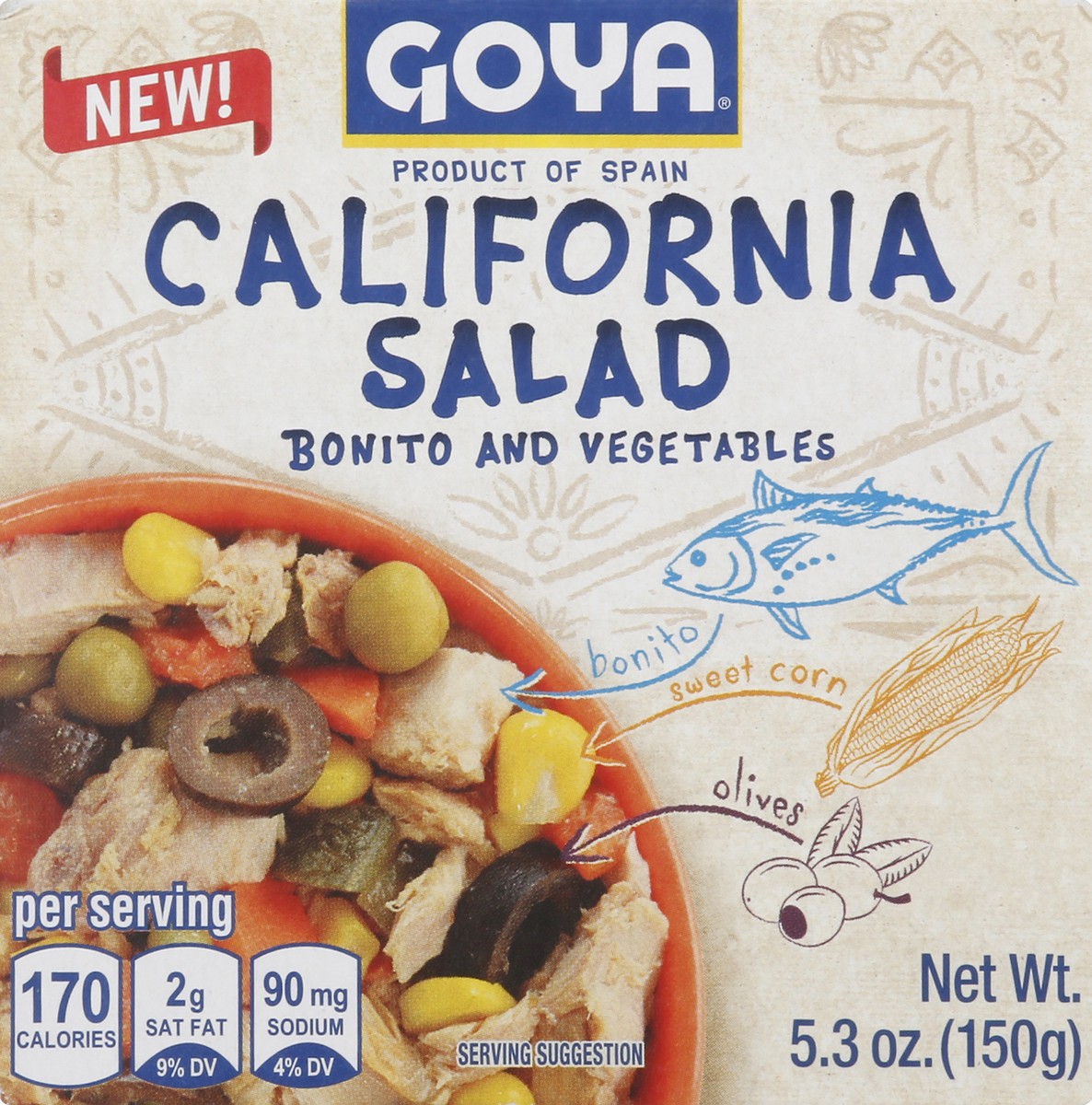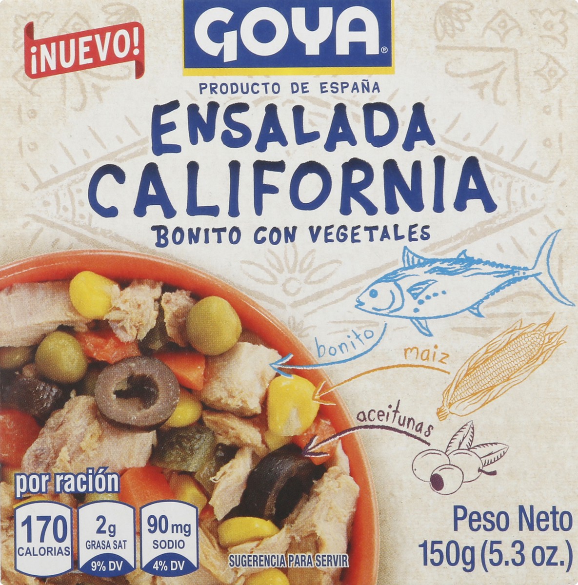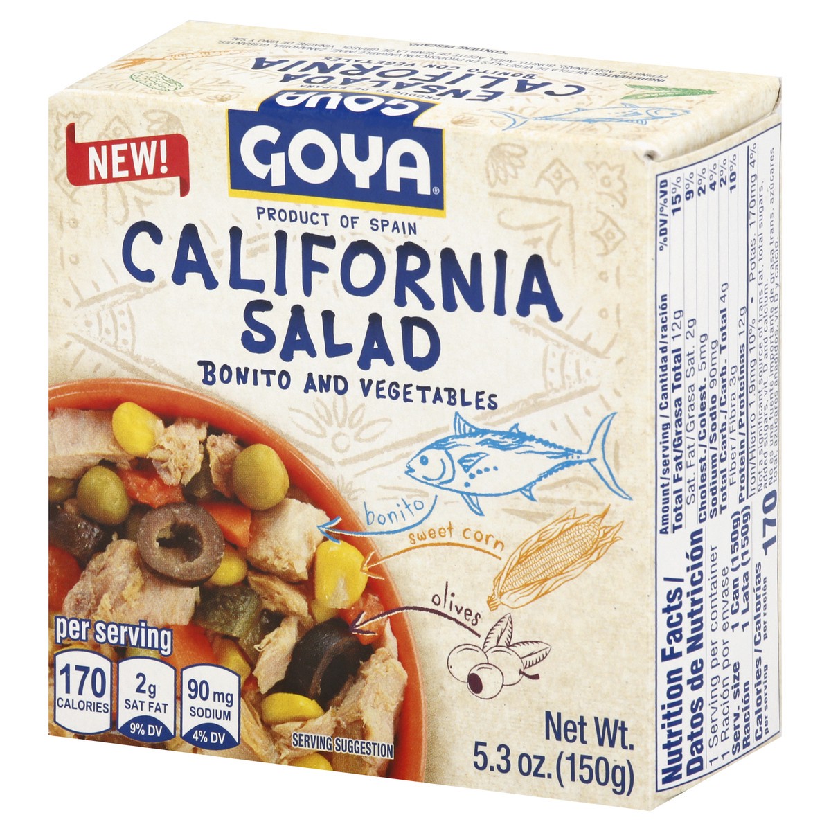New! Bonito. Sweet corn. Olives. Per Serving: 170 calories; 2 g sat fat (9% DV); 90 mg sodium (4% DV). www.goya.com. Product of Spain.