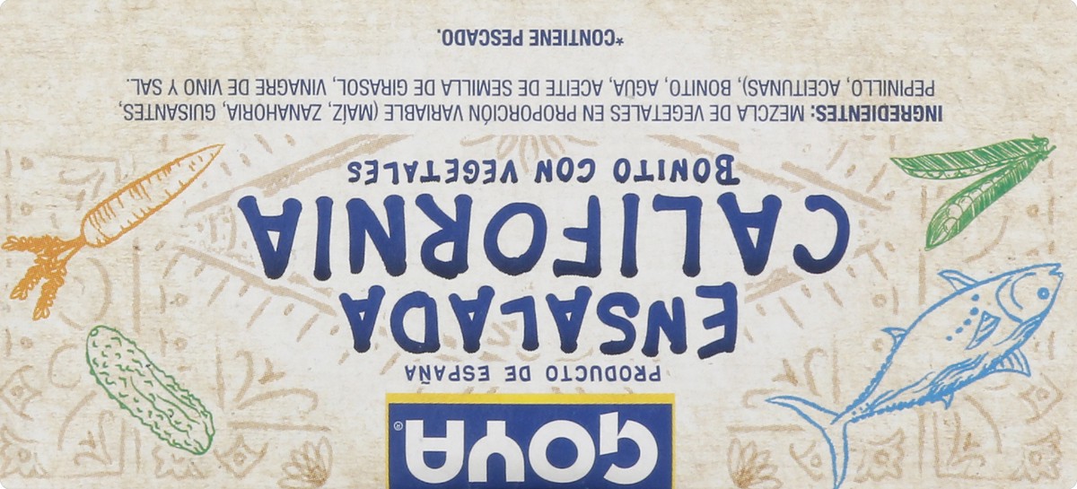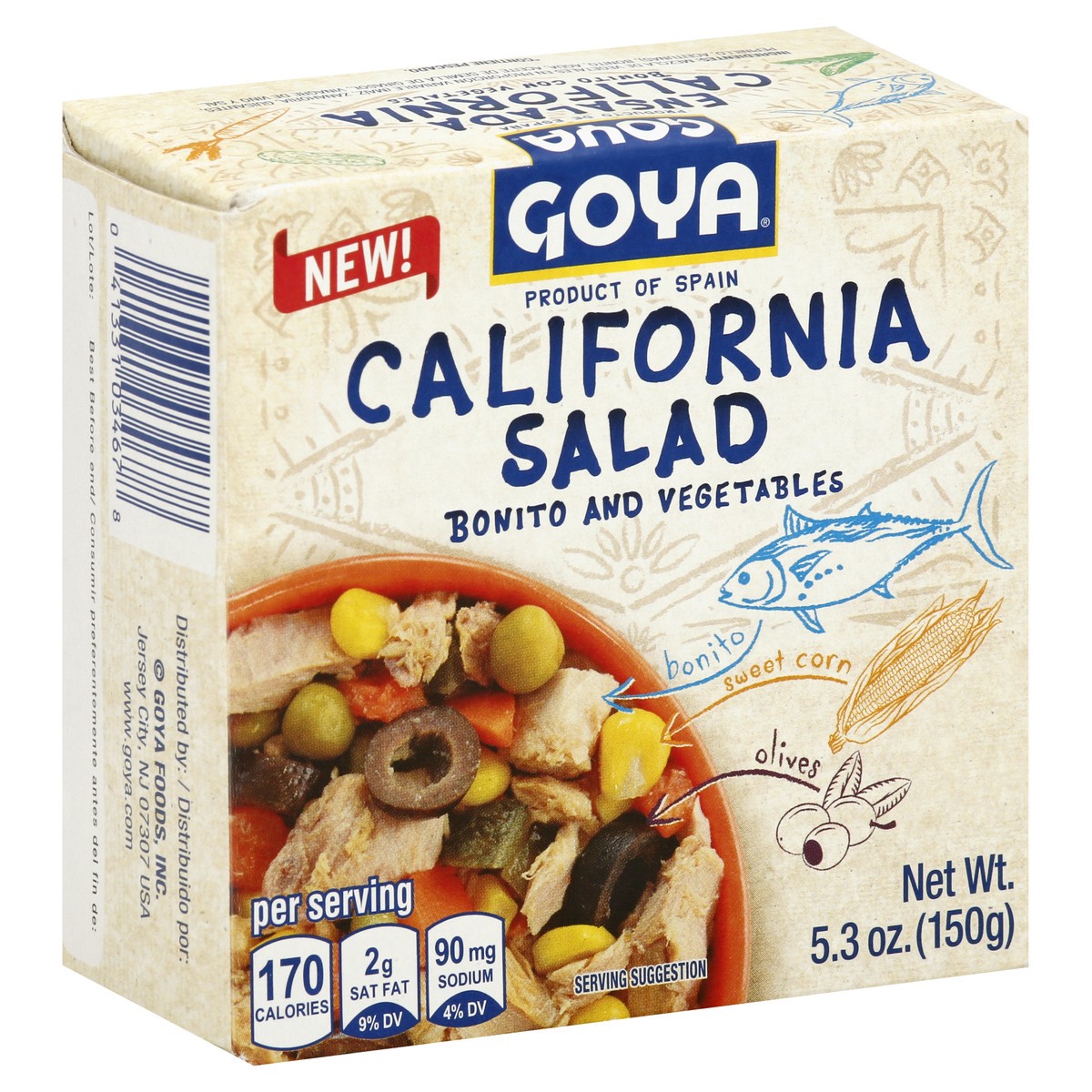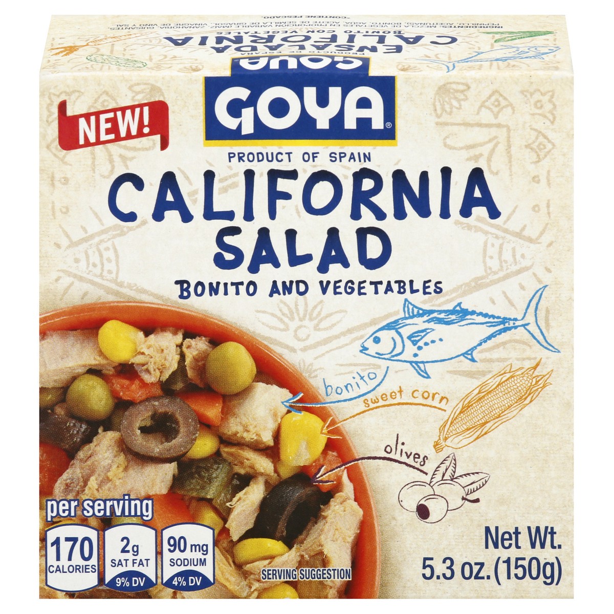 New! Bonito. Sweet corn. Olives. Per Serving: 170 calories; 2 g sat fat (9% DV); 90 mg sodium (4% DV). www.goya.com. Product of Spain.