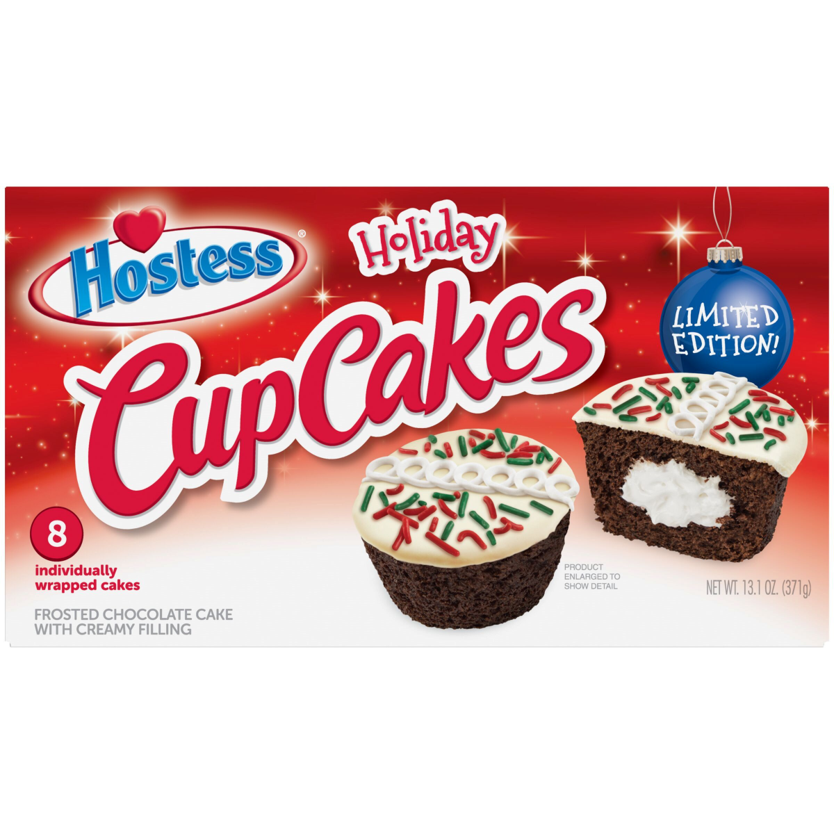 Deck the halls this season with HOSTESS Holiday CupCakes. Treat your taste buds to frosted chocolate cake, topped with extra festive sprinkles! Sink your teeth into the rich creamy filling at the hear…