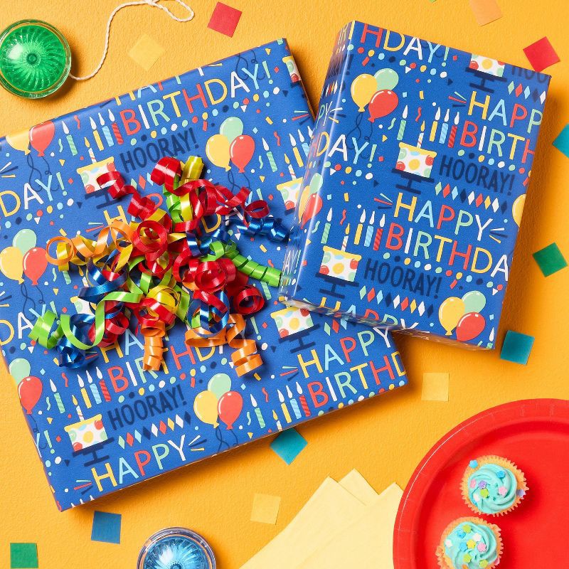 - Blue wrapping paper reads "Happy Birthday!" and features imagery of cakes and balloons for fun flair