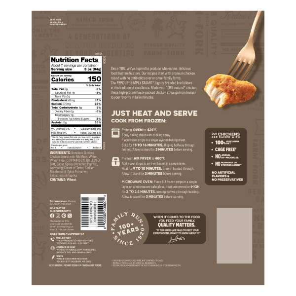 Perdue Simply Smart Lightly Breaded Spicy Chicken Strips are made of white meat from the chicken breast and 100 % natural chicken. No antibiotics ever. No animal by-products. No preservatives. High in…