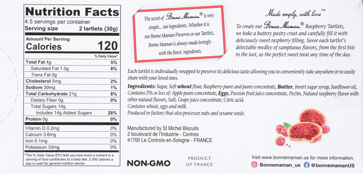 Non-GMO. Individually wrapped to preserve freshness. The secret of Bonne Maman is very simple - our ingredients. Whether it is our Bonne Maman preserves or our tartlets, Bonne Maman is always made lov…