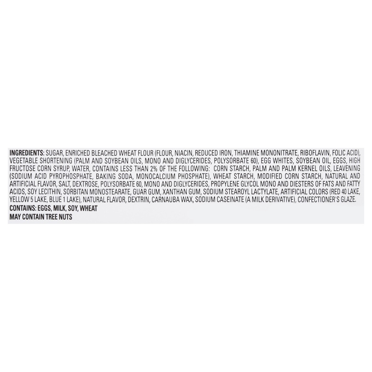 Sugar, Enriched Bleached Wheat Flour (Flour, Niacin, Reduced Iron, Thiamine Mononitrate, Riboflavin, Folic Acid), Vegetable Shortening (Palm and Soybean Oils, Mono and Diglycerides, Polysorbate 60), E…